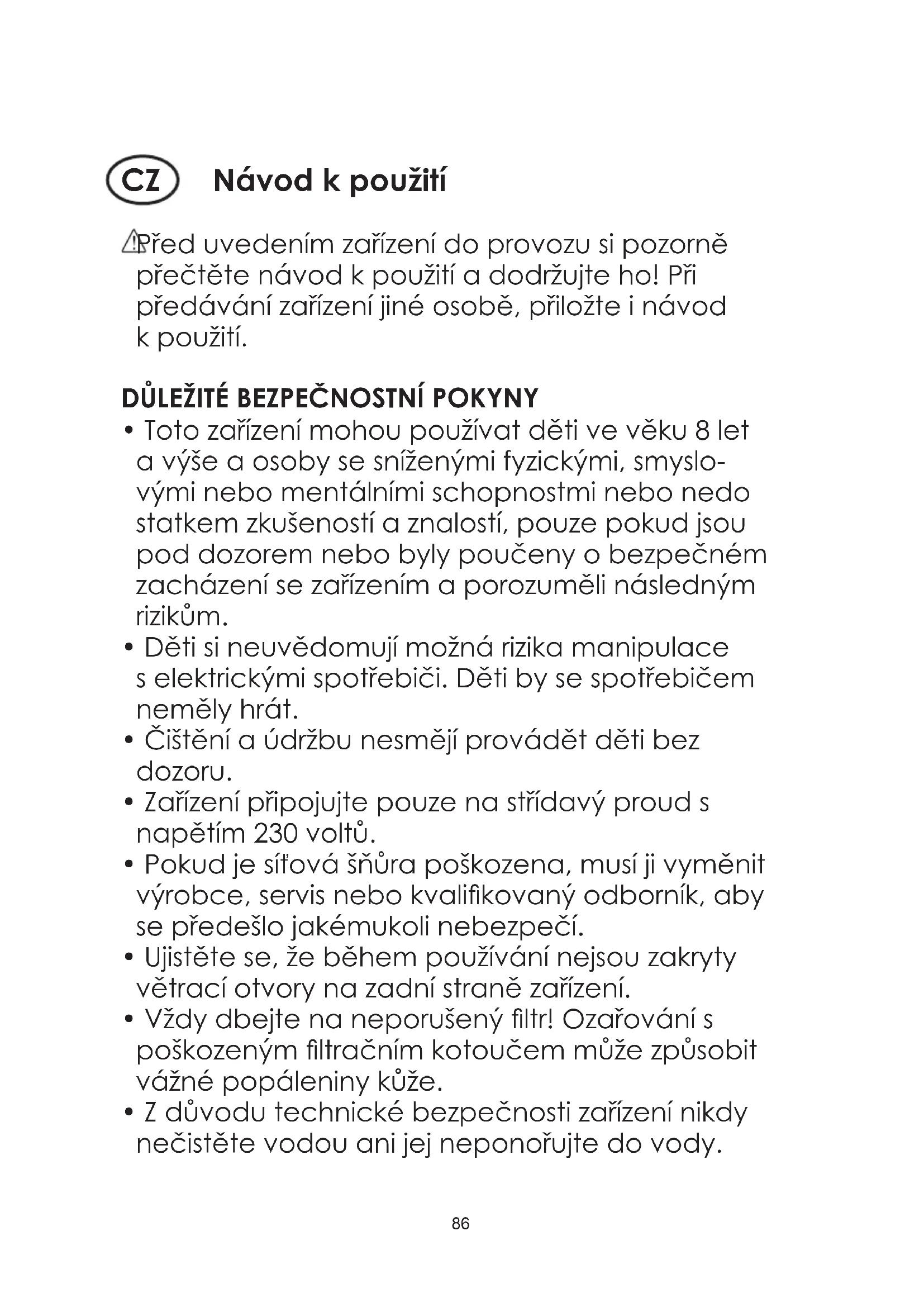 - Z důvodu technické bezpečnosti zařízení nikdy nečistěte vodou ani jej neponořujte do vody.87