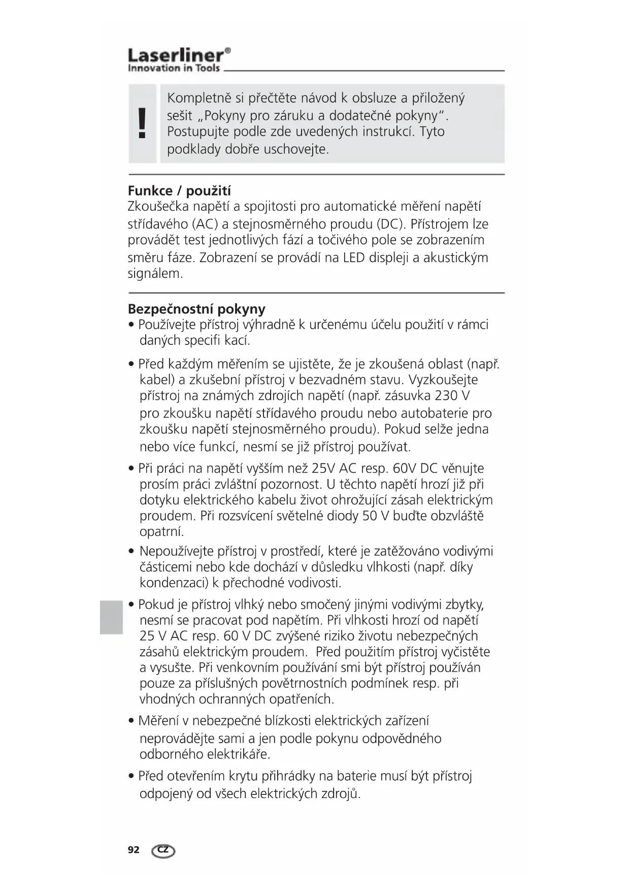 Ustanovení EU a likvidace PŪístroj splŢuje všechny potŪebné normy pro volná pohyb zboží v rámci EU. Tento výrobek je elektrický pŪístroj a musí být oddŌlenŌ vytŪídŌn a zlikvidován podle evropské smŌrnice pro použité elektrické a elektronické pŪístroje. Další bezpeňnostní a dodatkové pokyny najdete na: www.laserliner.com/info