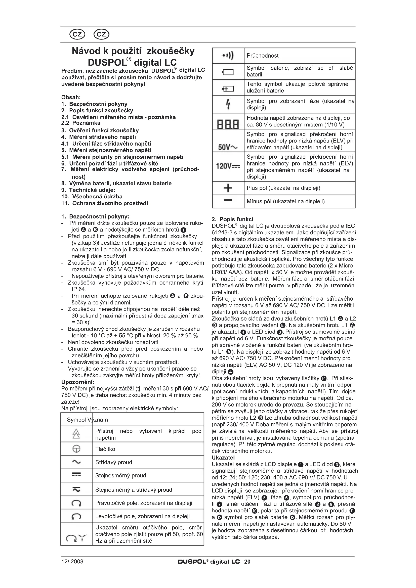 digital LC je dvoupólová zkoušečka podle IEC 61243-3 s digitálním ukazatelem. Jako doplňující zařízení obsahuje tato zkoušečka osvětlení měřeného místa a dis- pleje a ukazatel fáze a směru otáčivého pole a zařízením pro zkoušení průchodnosti. Signalizace při zkoušce prů- chodnosti je akustická i optická. Pro všechny tyto funkce potřebuje tato zkoušečka zabudované baterie (2 x Micro LR03/ AAA). Od napětí ≥ 50 V je možné provádět zkouš- ku napětí bez baterie. Měření fáze a směr otáčení fází třífázové sítě lze měřit pouze v případě, že je uzemněn uzel vinutí. Přístroj je určen k měření stejnosměrného a střídavého napětí v rozsahu 6 V až 690 V AC/ 750 V DC. Lze měřit i polaritu při stejnosměrném napětí. Zkoušečka se sládá ze dvou zkušebních hrotů L1 A a L2 B a propojovacího vedení . Na zkušebním hrotu L1 A je ukazatel 4 a LED diod 3. Přístroj se samovolně spíná při napětí od 6 V. Funkčnost zkoušečky je možná pouze při správně vložené a funkční baterii (ve zkušebním hro- tu L1 A). Na displeji lze zobrazit hodnoty napětí od 6 V až 690 V AC/ 750 V DC. Překročení mezní hodnoty pro nízká napětí (ELV, AC 50 V, DC 120 V) je zobrazeno na dipleji 4. Oba zkušební hroty jsou vybaveny tlačítky . Při stisk- nutí obou tlačítek dojde k přepnutí na malý vnitřní odpor (potlačení induktivních a kapacitních napětí). Tím dojde k připojení malého vibračního motorku na napětí. Od ca. 200 V se motorek uvede do provozu. Se stoupajícím na- pětím se zvyšují jeho otáčky a vibrace, tak že přes rukojeť měřícího hrotu L2 B lze zhruba odhadnout velikost napětí (např.230/ 400 V Doba měření s malým vnitřním odporem je závislá na velikosti měřeného napětí. Aby se přístroj příliš nepřehříval, je instalována tepelná ochrana (zpětná regulace). Při této zpětné regulaci dochází k poklesu otá- ček vibračního motorku. Ukazatel Ukazatel se skládá z LCD displeje 4 a LED diod 3, které signalizují stejnosměrné a střídavé napětí v hodnotách od 12; 24; 50; 120; 230; 400 a AC 690 V/ DC 750 V. U uvedených hodnot napětí se jedná o jmenovitá napětí. Na LCD displeji se zobrazuje: překročení horní hranice pro nízká napětí (ELV) 5, fáze 6, symbol pro průchodnos- ti 7, směr otáčení fází u třífázové sítě 8 a 9, přesná hodnota napětí , polarita při stejnosměrném proudu a symbol pro slabé baterie . Měřící rozsah pro ply- nulé měření napětí je nastavován automaticky. Do 80 V je hodota zobrazena s desetinnou čárkou, při hodotách vyšších tato čárka odpadá.12/ 2008 DUSPOL