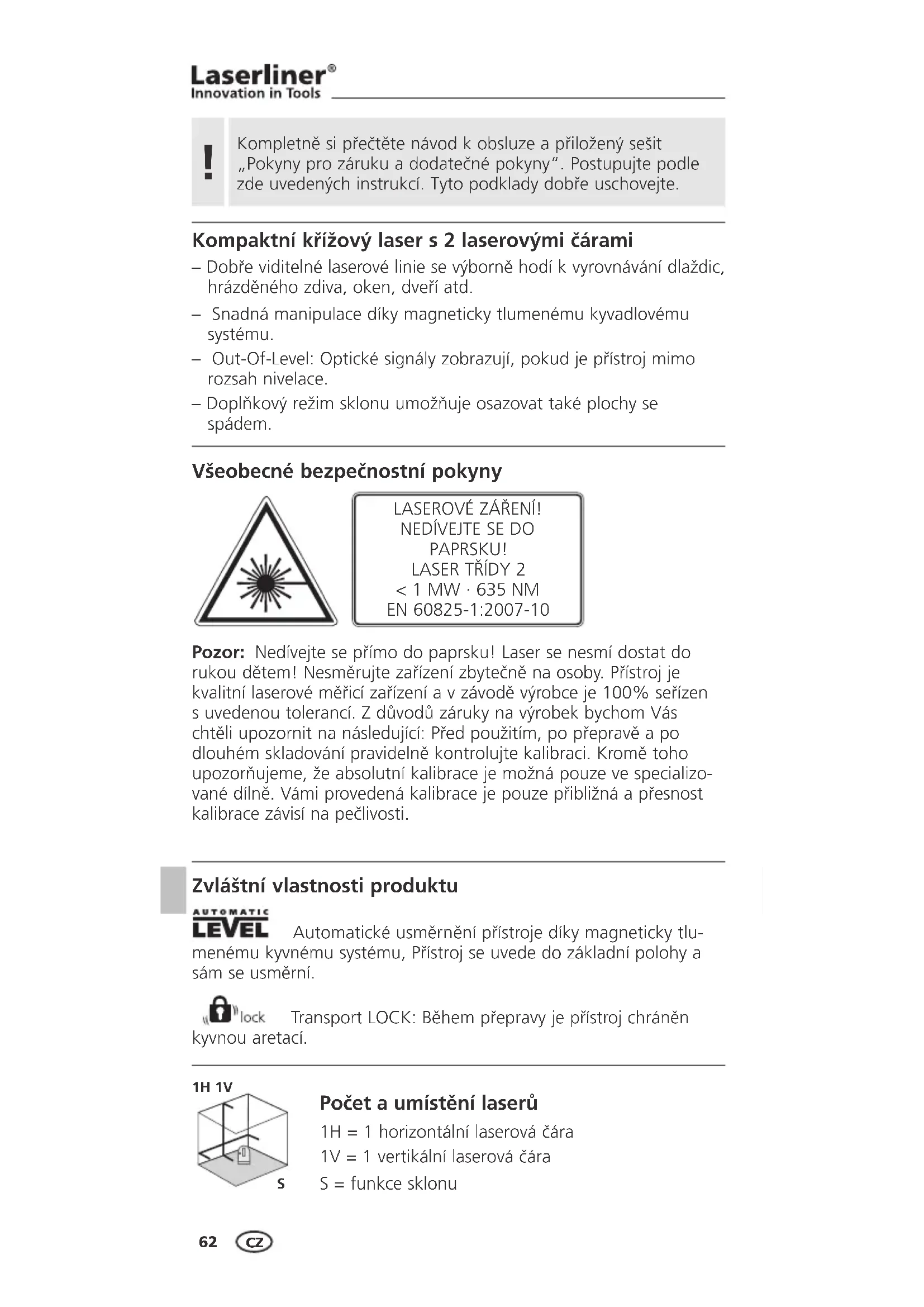 PAPRSKU! LASER TįÍDY 2 < 1 MW · 635 NM EN 60825-1:2007-10 Poêet a umístøní laserŃ 1H = 1 horizontální laserová ňára 1V = 1 vertikální laserová ňára S = funkce sklonu