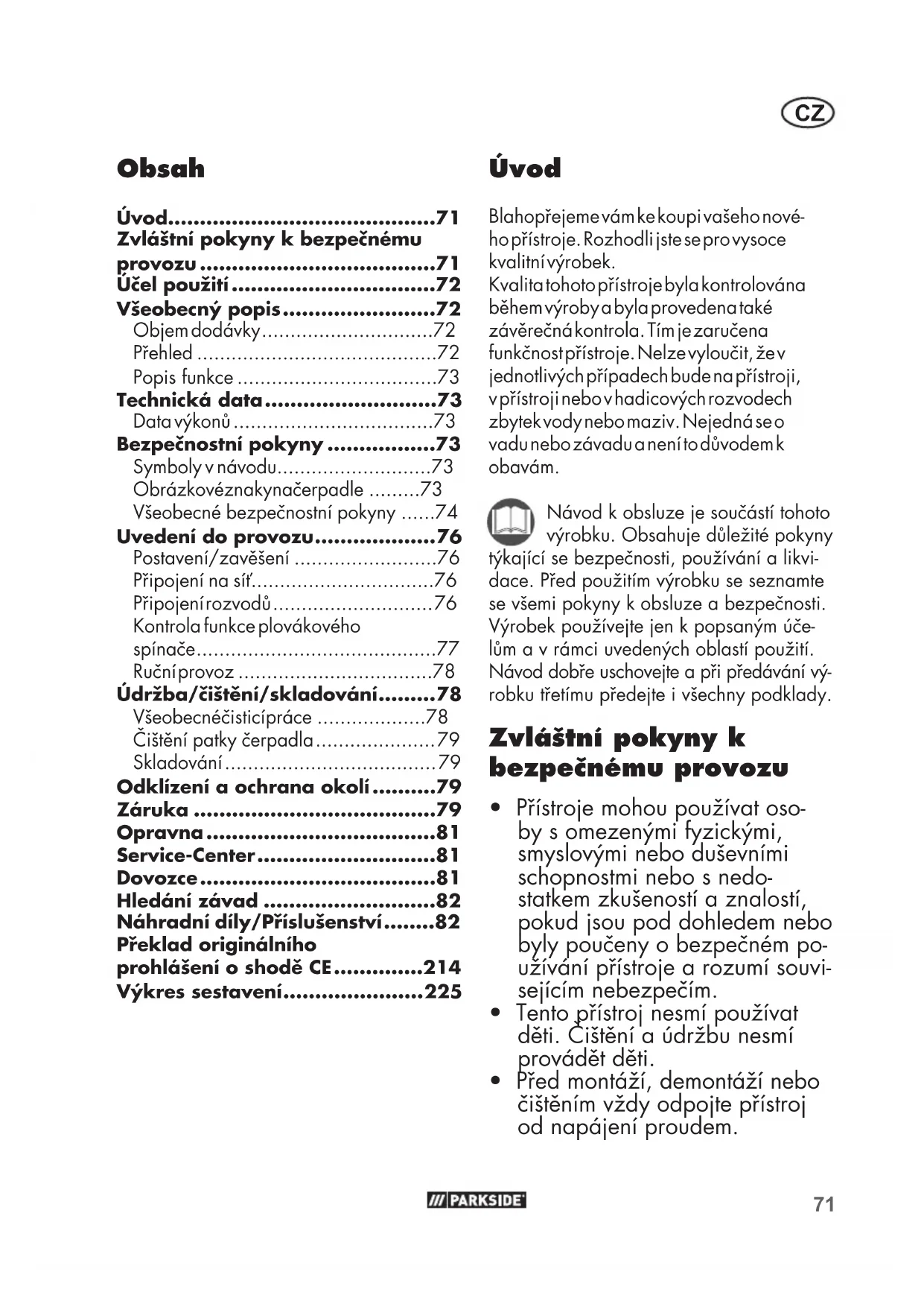 - Zvláštní pokyny k bezpečnému provozu p. 71