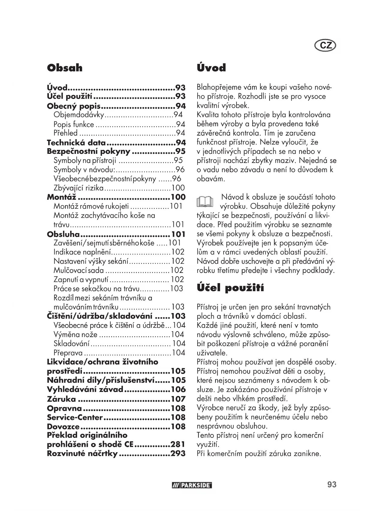 Úvod Blahopřejeme vám ke koupi vašeho nové- ho přístroje. Rozhodli jste se pro vysoce kvalitní výrobek. Kvalita tohoto přístroje byla kontrolována během výroby a byla provedena také závěrečná kontrola. Tím je zaručena funkčnost přístroje. Nelze vyloučit, že v jednotlivých případech se na nebo v přístroji nachází zbytky maziv. Nejedná se o vadu nebo závadu a není to důvodem k obavám. Návod k obsluze je součástí tohoto výrobku. Obsahuje důležité pokyny týkající se bezpečnosti, používání a likvi- dace. Před použitím výrobku se seznamte se všemi pokyny k obsluze a bezpečnosti. Výrobek používejte jen k popsaným úče- lům a v rámci uvedených oblastí použití. Návod dobře uschovejte a při předávání vý- robku třetímu předejte i všechny podklady. Účel použití Přístroj je určen jen pro sekání travnatých ploch a trávníků v domácí oblasti. Každé jiné použití, které není v tomto návodu výslovně schváleno, může způso- bit poškození přístroje a vážné poranění uživatele. Přístroj mohou používat jen dospělé osoby. Přístroj nemohou používat děti a osoby, které nejsou seznámeny s návodem k ob- sluze. Je zakázáno používání přístroje v dešti nebo vlhkém prostředí. Výrobce neručí za škody, jež byly způso- beny použitím k neurčenému účelu nebo nesprávnou obsluhou. Tento přístroj není určený pro komerční využití. Při komerčním použití záruka zanikne. Obsah Úvod..........................................93
