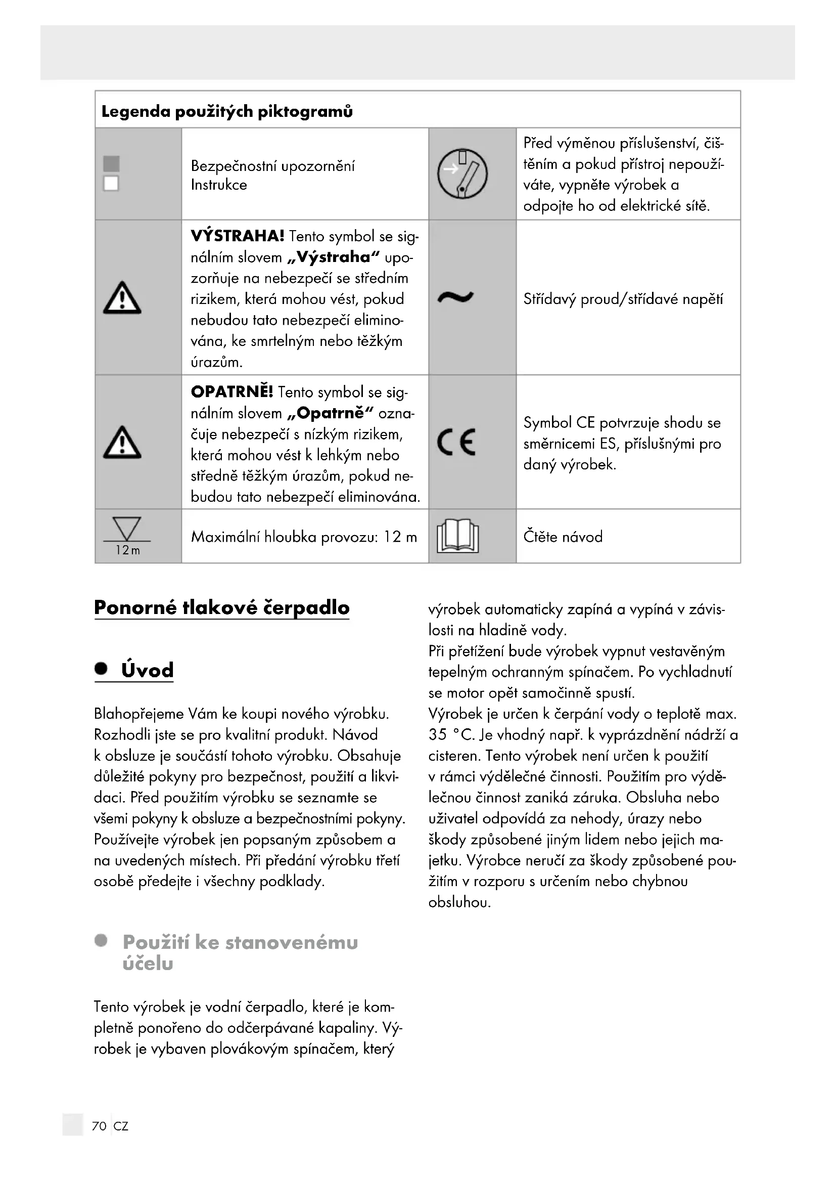 vodou od usazenin. Pravidelně odstraňujte ze dna šachty kal (nejpozději každé 3měsíce) a vyčistěte i stěny šachty. Nečistoty na spodní straně čerpadla mů- žete ostříkat čistou vodou. Veškerá jiná opatření, především otevírání vý- robku, smí provádět pouze elektrikář. Vpřípadě oprav vždy kontaktujte naše servisní centrum. Skladování výrobku Výrobek před uskladněním vyčistěte. Skladujte výrobek vsuchu, chráněný před mrazem a mimo dosah dětí. Pokud nebudete čerpadlo delší dobu použí- vat, musíte ho po posledním použití a před dalším použitím důkladně vyčistit. Zdůvodu usazenin a zbytků může jinak dojít kpotí- žím při rozběhu. Vyhledávání závad Problém Možná příčina Odstranění závady Čerpadlo se neroz- běhne. Žádné síťové napětí. Zkontrolujte zásuvku, síťový přívodní kabel, roz- vody, zástrčku, případně nechejte opravit od elektrikáře. Čerpadlo nečerpá. Vstupní mřížka paty čerpadla je ucpaná. Vyčistěte vstupní mřížku paty čerpadla proudem vody (viz „Obecné čištění“). Výkon čerpadla je nižší zdůvodu silného znečištění a příměsí ve vodě se silně abrazivními účinky. Vyčistěte čerpadlo. Čerpadlo nevypíná. Plovákový spínač se nemůže spustit dolů. Správně ustavte čerpadlo na dně šachty.78 CZ Problém Možná příčina Odstranění závady Nedosta- tečné čerpané množství. Vstupní mřížka paty čerpadla je ucpaná. Vyčistěte vstupní mřížku paty čerpadla proudem vody (viz „Obecné čištění“). Výkon čerpadla je nižší zdůvodu silného znečištění a příměsí ve vodě se silně abrazivními účinky. Vyčistěte čerpadlo. Čerpadlo se po krátké chvíli vypne. Motorový jistič vypnul čerpadlo zdůvodu přílišného znečištění vody. Odpojte zástrčku ze zásuvky a vyčistěte čerpa- dlo a šachtu. Příliš vysoká teplota vody, moto- rový jistič vypnul výrobek. Pamatujte na maximální teplotu vody 35 °C! Zlikvidování Obal se skládá zekologických materiálů, které můžete zlikvidovat prostřednictvím místních sbě- ren recyklovatelných materiálů.