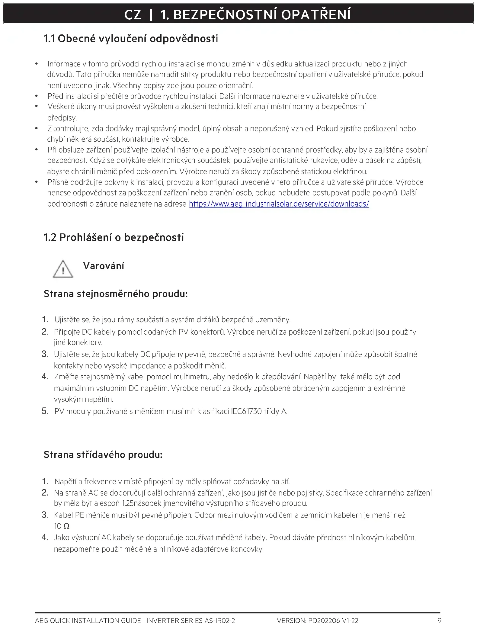 - Přísně dodržujte pokyny k instalaci, provozu a konfiguraci uvedené v této příručce a uživatelské příručce. Výrobce nenese odpovědnost za poškození zařízení nebo zranění osob, pokud nebudete postupovat podle pokynů. Další podrobnosti o záruce naleznete na adrese https://www.aeg-industrialsolar.de/service/downloads/