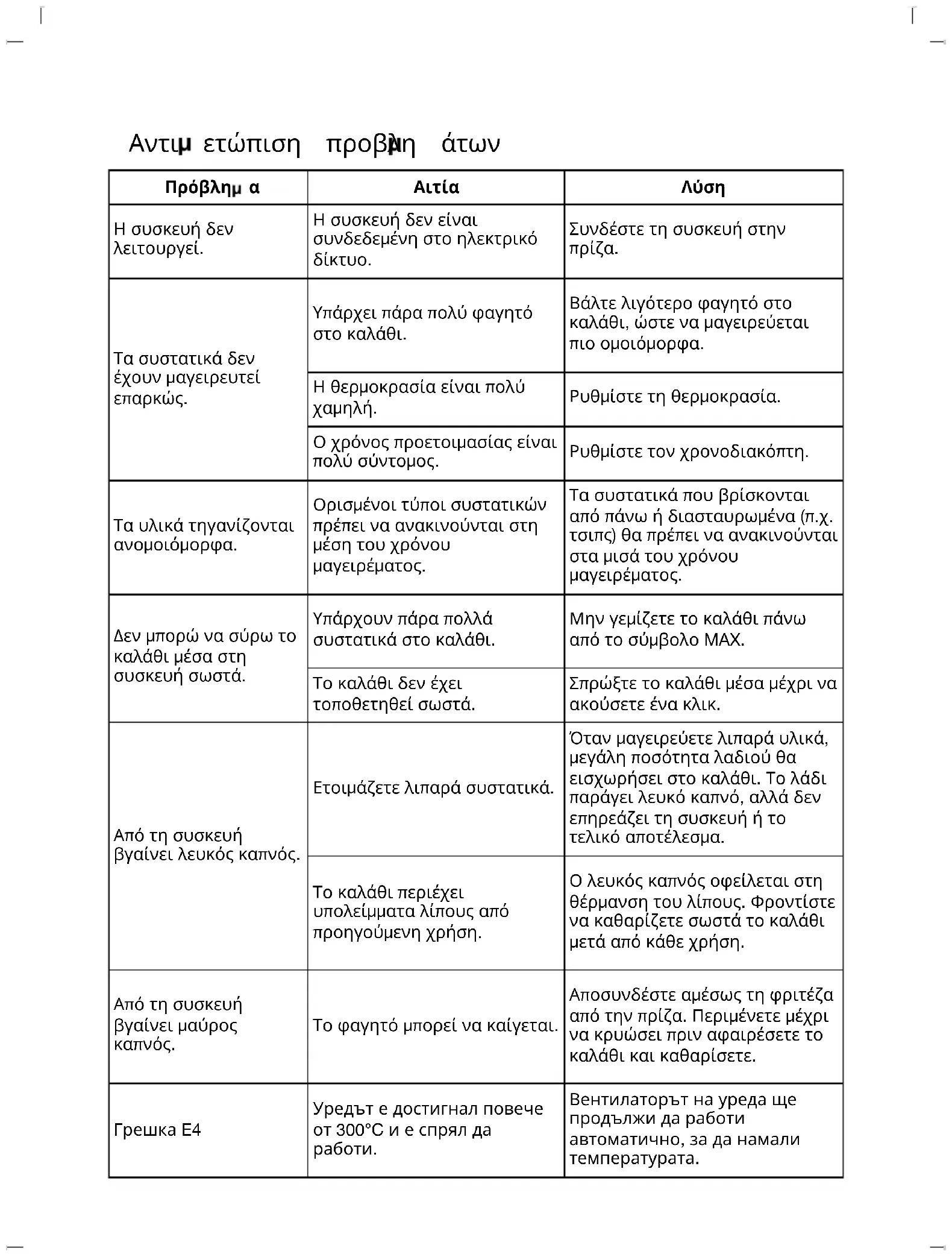 Spotřebič nefunguje. Spotřebič není připojen k elektrické síti. Zapojte spotřebič. Složky nejsou dostatečně propečené V košíku je příliš mnoho jídla. Vložte do koše méně potravin, aby se rovnoměrněji uvařily. Teplota je příliš nízká. Nastavte teplotu. Doba přípravy je příliš krátká. Nastavte časovač. Složky jsou smažené nerovnoměrně. Některé druhy ingrediencí je třeba v polovině vaření protřepat. Přísady, které jsou nahoře nebo zkřížené (např. hranolky), by se měly v polovině doby vaření protřepat. Koš nelze do spotřebiče správně zasunout. V košíku je příliš mnoho ingrediencí. Nenaplňujte koš nad symbol MAX. Koš není správně umístěn. Zatlačte koš, dokud neuslyšíte cvaknutí. Ze spotřebiče vychází bílý kouř. Připravujete tučné ingredience. Při vaření tučných surovin se do koše dostane velké množství oleje. Olej vytváří bílý kouř, ale nemá vliv na spotřebič ani na konečný výsledek. Koš obsahuje zbytky tuku z předchozího použití. Bílý kouř je způsoben zahříváním tuku. Po každém použití koš řádně vyčistěte. Ze spotřebiče vychází černý kouř. Jídlo se může připalovat. Fritézu ihned odpojte ze sítě. Před vyjmutím koše a čištěním počkejte, až vychladne. Chyba E4 Spotřebič dosáhl teploty vyšší než 300 °C a přestal fungovat. Ventilátor spotřebiče bude pokračovat v automatickém provozu, aby se snížila teplota. Ř ůﺔﻠﻜﺸﻣ