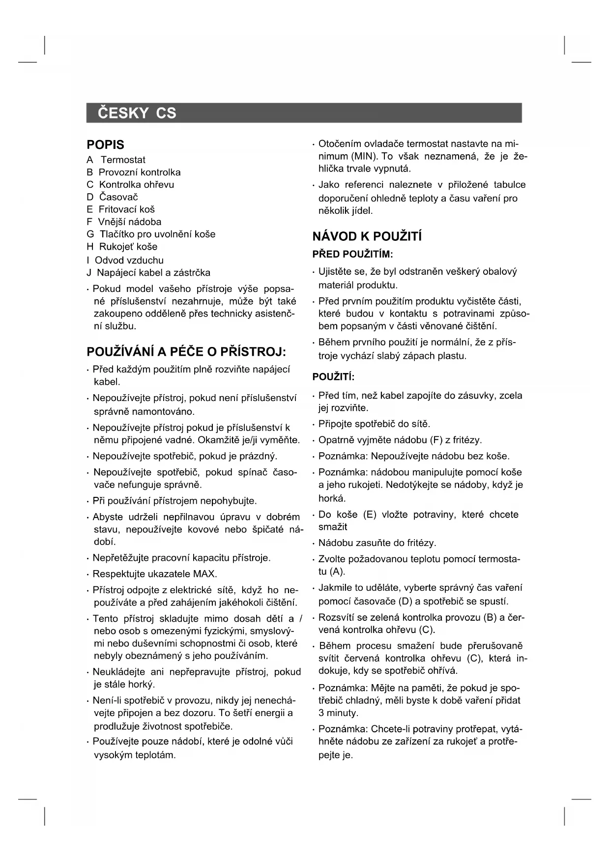 - CS Množství potravin (g)) Čas (min) Teplota (°C) Protřepat Další informace Brambory a hranolky Tenké mražené hranolky 300-700 9-16 200 Protřepat Tlusté mražené hranolky 300-700 11-20 200 Protřepat Domácí hranolky (8 × 8 mm) 300-800 16-20 200 Protřepat Přidejte 1/2 lžíce oleje Brambory nakrájené na měsíčky 300-800 18-22 180 Protřepat Přidejte 1/2 lžíce oleje Brambory nakrájené na kostičky 300-750 12-18 180 Protřepat Přidejte 1/2 lžíce oleje Indický chléb roti 250 15-18 180 Protřepat Gratinované brambory 500 15-18 200 Protřepat Maso a drůbež Steak 100-500 8-12 180 Vepřové kotlety 100-500 10-14 180 Hamburger 100-500 7-14 180 Párkové rolky 100-500 13-15 180 Kuřecí paličky 100-500 18-22 180 Kuřecí prsa 100-500 10-15 180 Malé občerstvení Jarní rolky 100-400 8-10 200 Protřepat Použijte polotovar Mražené kuřecí nugetky 100-500 6-10 200 Protřepat Použijte polotovar Mražené rybí prsty 100-400 6-10 200 Použijte polotovar Mražený obalovaný sýr 100-400 8-10 180 Použijte polotovar Plněná zelenina 100-400 10 160 Pečení Použijte formu na pečení Dort 300 20-25 160 Použijte formu na pečení / pekáč Quiche 400 20-22 180 Použijte formu na pečení Mufny 300 15-18 200 Použijte formu na pečení / pekáčCS Problém Možná příčina Řešení Horkovzdušná fritéza nefunguje. Spotřebič není zapojen. Vložte síťovou zástrčku do uzemněné zásuvky ve zdi. Nenastavili jste časovač. Otočte knoík časovače na požadovanou dobu přípravy pro zapnutí přístroje. Pokrmy nejsou hotové. Množství potravin v koši je příliš velké. Vkládejte menší dávky potravin do koše. Menší dávky jsou smažené rovnoměrněji. Nastavená teplota je příliš nízká. Otočte knoík pro nastavení teploty do požadované polohy. Nastavení teploty - viz tabulka s doporučeným časem vaření. Pokrmy jsou smažené nerovnoměrně. Některé pokrmy je třeba protřepat po uplynutí poloviny doby přípravy. Potraviny, které leží na vrcholu nebo přes sebe (např. hranolky) potřebují být protřepány po uplynutí poloviny doby přípravy. Smažené pokrmy nejsou křupavé. Použili jste nesprávný typ potravin. Viz pokyny k vaření od výrobců potravin. Nelze zasunout nádobu / koš do fritézy. Koš je přeplněný. Nenaplňujte koš nad značku MAX. Koš není správně vložen do nádoby. Zatlačte koš dolů do nádoby, dokud neuslyšíte cvaknutí. Z fritézy jde bílý kouř. Byly použity potraviny s vysokým obsahem oleje. K potravinám byl přidán olej. Nepoužívejte typ potravin s vysokým obsahem oleje ani nepřidávejte další olej, pokud to není nutné. Fritéza používá technologii, která nevyžaduje žádné nebo malé množství oleje. V nádobě jsou stále zbytky tuku z předchozího použití. Bílý kouř je způsoben zahříváním tuku v nádobě. Ujistěte se, že jste nádobu po každém použití řádně vyčistili.POLSKI PL OPIS A Termostat B Kontrolka funkcjonowania C Kontrolka nagrzewania D Czasomierz E Kosz do smażenia F Miska G Przycisk otwierania Koszyk H Uchwyt koszyka I Wylot powietrza J Kabel zasilający i wtyczka