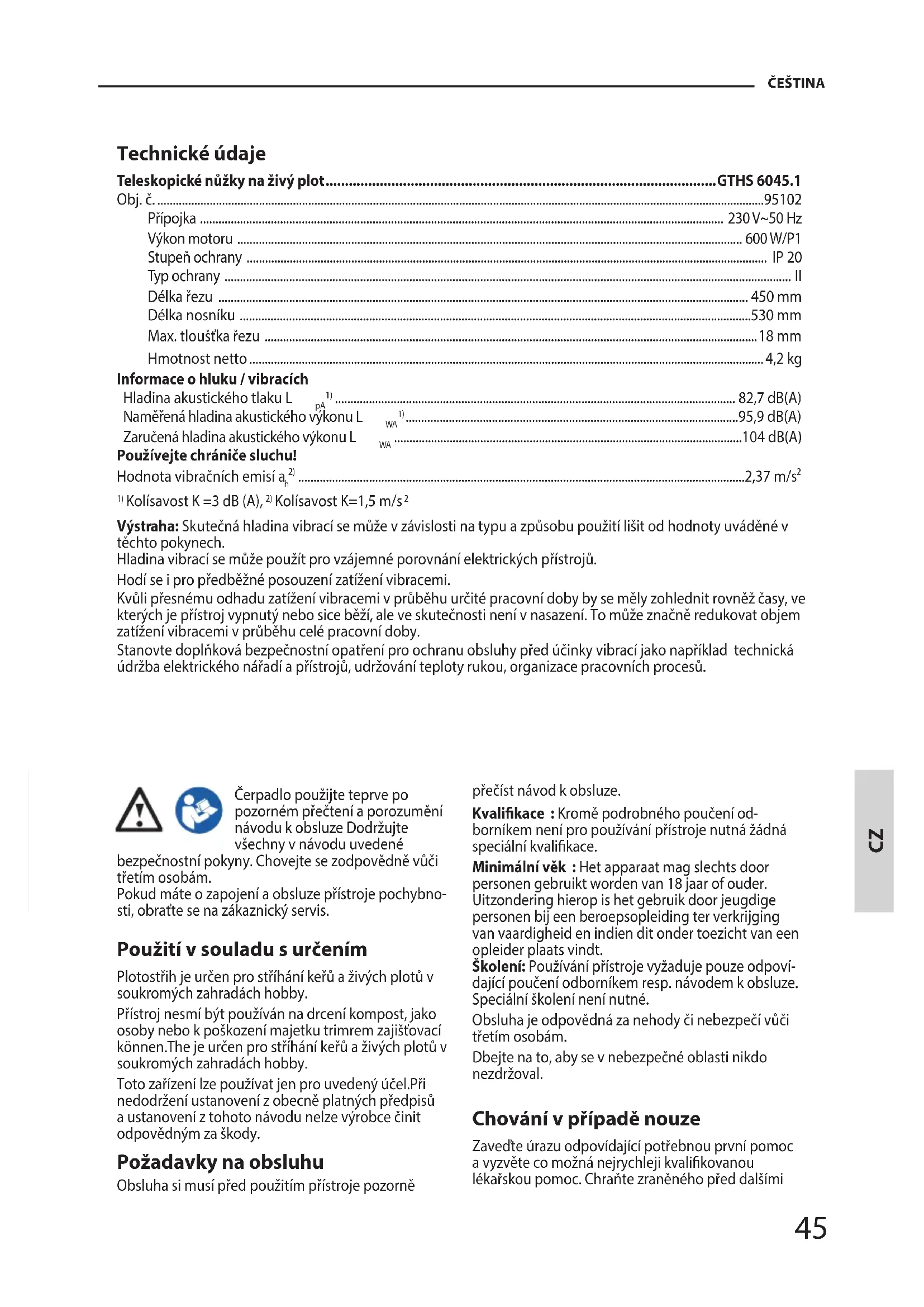 Čerpadlo použijte teprve po pozorném přečtení a porozumění návodu k obsluze Dodržujte všechny v návodu uvedené bezpečnostní pokyny. Chovejte se zodpovědně vůči třetím osobám. Pokud máte o zapojení a obsluze přístroje pochybno- sti, obraťte se na zákaznický servis. Použití v souladu s určením Plotostřih je určen pro stříhání keřů a živých plotů v soukromých zahradách hobby. Přístroj nesmí být používán na drcení kompost, jako osoby nebo k poškození majetku trimrem zajišťovací können.The je určen pro stříhání keřů a živých plotů v soukromých zahradách hobby. Toto zařízení lze používat jen pro uvedený účel.Při nedodržení ustanovení z obecně platných předpisů a ustanovení z tohoto návodu nelze výrobce činit odpovědným za škody. Požadavky na obsluhu Obsluha si musí před použitím přístroje pozorně Technické údaje Teleskopické nůžky na živý plot ..................................................................................................... GTHS 6045.1 Obj. č. .....................................................................................................................................................................................................95102 Přípojka .......................................................................................................................................................................... 230 V~50 Hz Výkon motoru .................................................................................................................................................................... 600 W/P1 Stupeň ochrany ......................................................................................................................................................................... IP 20 Typ ochrany ........................................................................................................................................................................................ II Délka řezu ............................................................................................................................................................................ 450 mm Délka nosníku ......................................................................................................................................................................530 mm Max. tloušťka řezu ................................................................................................................................................................ 18 mm Hmotnost netto ....................................................................................................................................................................... 4,2 kg Informace o hluku / vibracích Hladina akustického tlaku L