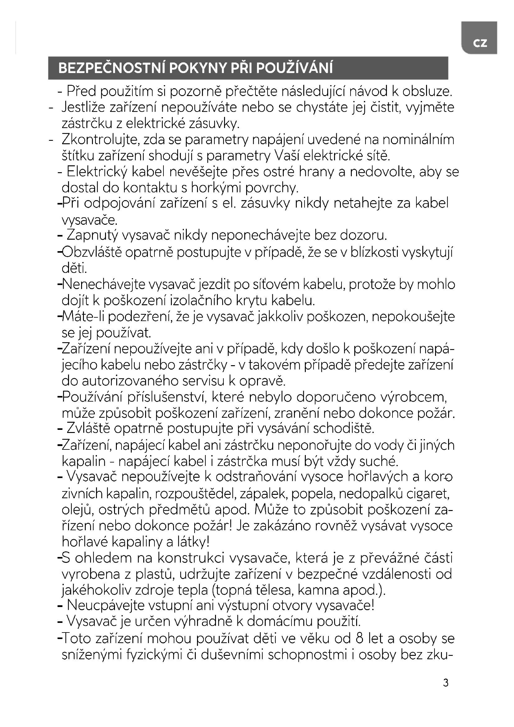 Při odpojování zařízení s el. zásuvky nikdy netahejte za kabel vysavače. - Zapnutý vysavač nikdy neponechávejte bez dozoru.
