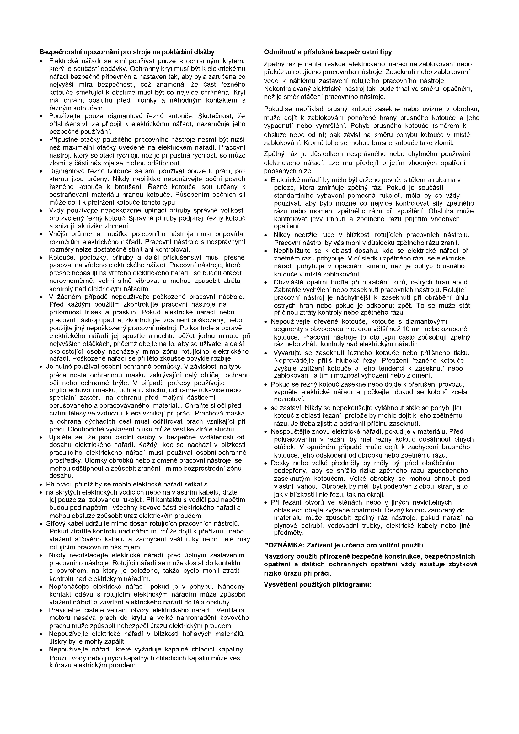 - Při řezání otvorů ve stěnách nebo v jiných neviditelných oblastech dbejte zvýšené opatrnosti. Řezný kotouč zanořený do materiálu může způsobit zpětný ráz nástroje, pokud narazí na plynové potrubí, vodovodní trubky, elektrické kabely nebo jiné předměty. POZNÁMKA: Zařízení je určeno pro vnitřní použití Navzdory použití přirozeně bezpečné konstrukce, bezpečnostních opatření a dalších ochranných opatření vždy existuje zbytkové riziko úrazu při práci. Vysvětlení použitých piktogramů:1. Poznámka: Přijměte zvláštní opatření