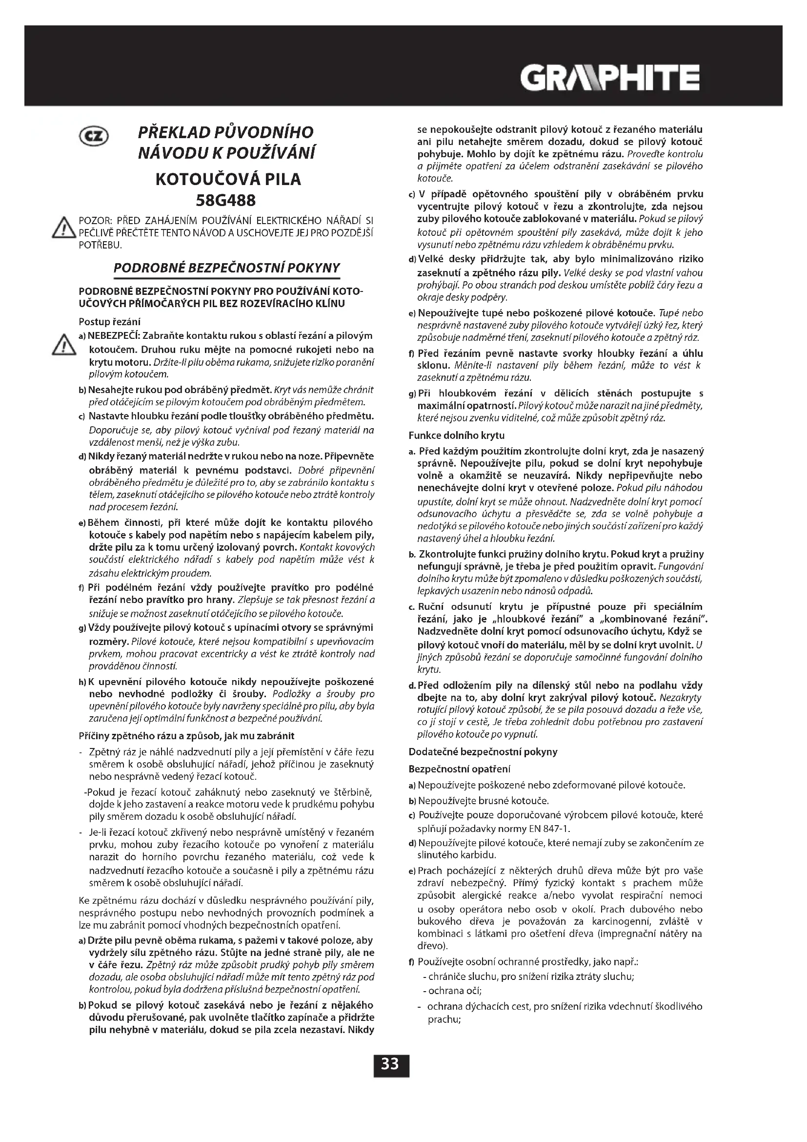 PODROBNÉ BEZPEČNOSTNÍ POKYNY PRO POUŽÍVÁNÍ KOTO UČOVÝCH PŘÍMOČARÝCH PIL BEZ ROZEVÍRACÍHO KLÍNU Postup řezání a) NEBEZPEČÍ: Zabraňte kontaktu rukou s oblastí řezání a pilovým kotoučem. Druhou ruku mějte na pomocné rukojeti nebo na krytu motoru. Držíte-li pilu oběma rukama, snižujete riziko poranění pilovým kotoučem. b) Nesahejte rukou pod obráběný předmět. Kryt vás nemůže chránit před otáčejícím se pilovým kotoučem pod obráběným předmětem. c) Nastavte hloubku řezání podle tloušťky obráběného předmětu. Doporučuje se, aby pilový kotouč vyčníval pod řezaný materiál na vzdálenost menší, než je výška zubu. d) Nikdy řezaný materiál nedržte v rukou nebo na noze. Připevněte obráběný materiál k pevnému podstavci. Dobré připevnění obráběného předmětu je důležité pro to, aby se zabránilo kontaktu s tělem, zaseknutí otáčejícího se pilového kotouče nebo ztrátě kontroly nad procesem řezání. e) Během činnosti, při které může dojít ke kontaktu pilového kotouče s kabely pod napětím nebo s napájecím kabelem pily, držte pilu za k tomu určený izolovaný povrch. Kontakt kovových součástí elektrického nářadí s kabely pod napětím může vést k zásahu elektrickým proudem. f) Při podélném řezání vždy používejte pravítko pro podélné řezání nebo pravítko pro hrany. Zlepšuje se tak přesnost řezání a snižuje se možnost zaseknutí otáčejícího se pilového kotouče. g) Vždy používejte pilový kotouč s upínacími otvory se správnými rozměry. Pilové kotouče, které nejsou kompatibilní s upevňovacím prvkem, mohou pracovat excentricky a vést ke ztrátě kontroly nad prováděnou činností. h) K upevnění pilového kotouče nikdy nepoužívejte poškozené nebo nevhodné podložky či šrouby. Podložky a šrouby pro upevnění pilového kotouče byly navrženy speciálně pro pilu, aby byla zaručena její optimální funkčnost a bezpečné používání. Příčiny zpětného rázu a způsob, jak mu zabránit - Zpětný ráz je náhlé nadzvednutí pily a její přemístění v čáře řezu směrem k osobě obsluhující nářadí, jehož příčinou je zaseknutý nebo nesprávně vedený řezací kotouč. - Pokud je řezací kotouč zaháknutý nebo zaseknutý ve štěrbině, dojde k jeho zastavení a reakce motoru vede k prudkému pohybu pily směrem dozadu k osobě obsluhující nářadí. - Je-li řezací kotouč zkřivený nebo nesprávně umístěný v řezaném prvku, mohou zuby řezacího kotouče po vynoření z materiálu narazit do horního povrchu řezaného materiálu, což vede k nadzvednutí řezacího kotouče a současně i pily a zpětnému rázu směrem k osobě obsluhující nářadí. Ke zpětnému rázu dochází v důsledku nesprávného používání pily, nesprávného postupu nebo nevhodných provozních podmínek a lze mu zabránit pomocí vhodných bezpečnostních opatření. a) Držte pilu pevně oběma rukama, s pažemi v takové poloze, aby vydržely sílu zpětného rázu. Stůjte na jedné straně pily, ale ne v čáře řezu. Zpětný ráz může způsobit prudký pohyb pily směrem dozadu, ale osoba obsluhující nářadí může mít tento zpětný ráz pod kontrolou, pokud byla dodržena příslušná bezpečnostní opatření. b) Pokud se pilový kotouč zasekává nebo je řezání z nějakého důvodu přerušované, pak uvolněte tlačítko zapínače a přidržte pilu nehybně v materiálu, dokud se pila zcela nezastaví. Nikdy se nepokoušejte odstranit pilový kotouč z řezaného materiálu ani pilu netahejte směrem dozadu, dokud se pilový kotouč pohybuje. Mohlo by dojít ke zpětnému rázu. Proveďte kontrolu a přijměte opatření za účelem odstranění zasekávání se pilového kotouče. c) V případě opětovného spouštění pily v obráběném prvku vycentrujte pilový kotouč v řezu a zkontrolujte, zda nejsou zuby pilového kotouče zablokované v materiálu. Pokud se pilový kotouč při opětovném spouštění pily zasekává, může dojít k jeho vysunutí nebo zpětnému rázu vzhledem k obráběnému prvku. d) Velké desky přidržujte tak, aby bylo minimalizováno riziko zaseknutí a zpětného rázu pily. Velké desky se pod vlastní vahou prohýbají. Po obou stranách pod deskou umístěte poblíž čáry řezu a okraje desky podpěry. e) Nepoužívejte tupé nebo poškozené pilové kotouče. Tupé nebo nesprávně nastavené zuby pilového kotouče vytvářejí úzký řez, který způsobuje nadměrné tření, zaseknutí pilového kotouče a zpětný ráz. f) Před řezáním pevně nastavte svorky hloubky řezání a úhlu sklonu. Měníte-li nastavení pily během řezání, může to vést k zaseknutí a zpětnému rázu. g) Při hloubkovém řezání v dělicích stěnách postupujte s maximální opatrností. Pilový kotouč může narazit na jiné předměty, které nejsou zvenku viditelné, což může způsobit zpětný ráz. Funkce dolního krytu a. Před každým použitím zkontrolujte dolní kryt, zda je nasazený správně. Nepoužívejte pilu, pokud se dolní kryt nepohybuje volně a okamžitě se neuzavírá. Nikdy nepřipevňujte nebo nenechávejte dolní kryt v otevřené poloze. Pokud pilu náhodou upustíte, dolní kryt se může ohnout. Nadzvedněte dolní kryt pomocí odsunovacího úchytu a přesvědčte se, zda se volně pohybuje a nedotýká se pilového kotouče nebo jiných součástí zařízení pro každý nastavený úhel a hloubku řezání. b. Zkontrolujte funkci pružiny dolního krytu. Pokud kryt a pružiny nefungují správně, je třeba je před použitím opravit. Fungování dolního krytu může být zpomaleno v důsledku poškozených součástí, lepkavých usazenin nebo nánosů odpadů. c. Ruční odsunutí krytu je přípustné pouze při speciálním řezání, jako je „hloubkové řezání” a „kombinovan