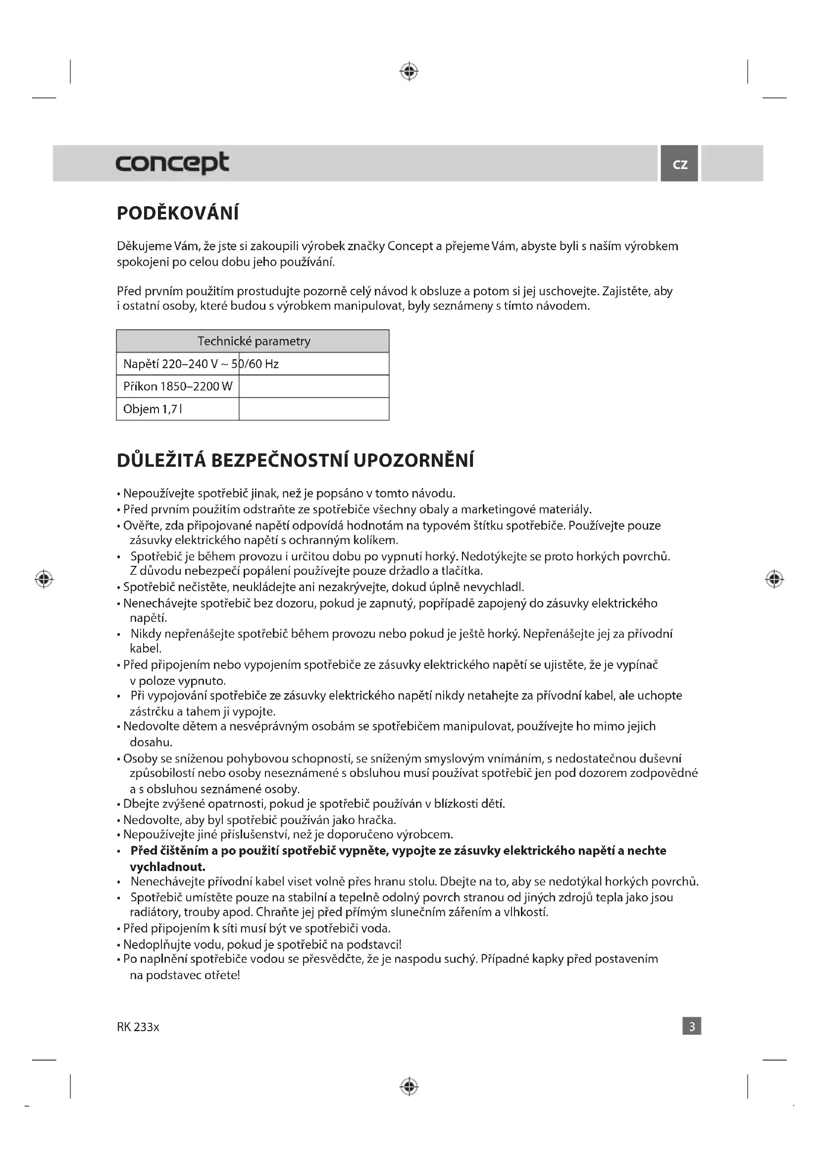 Děkujeme Vám, že jste si zakoupili výrobek značky Concept a přejeme Vám, abyste byli s naším výrobkem spokojeni po celou dobu jeho používání. Před prvním použitím prostudujte pozorně celý návod k obsluze a potom si jej uschovejte. Zajistěte, aby i ostatní osoby, které budou s výrobkem manipulovat, byly seznámeny s tímto návodem. Technické parametry Napětí 220–240 V ~ 50/60 Hz Příkon 1850–2200 W Objem 1,7 l DŮLEŽITÁ BEZPEČNOSTNÍ UPOZORNĚNÍ