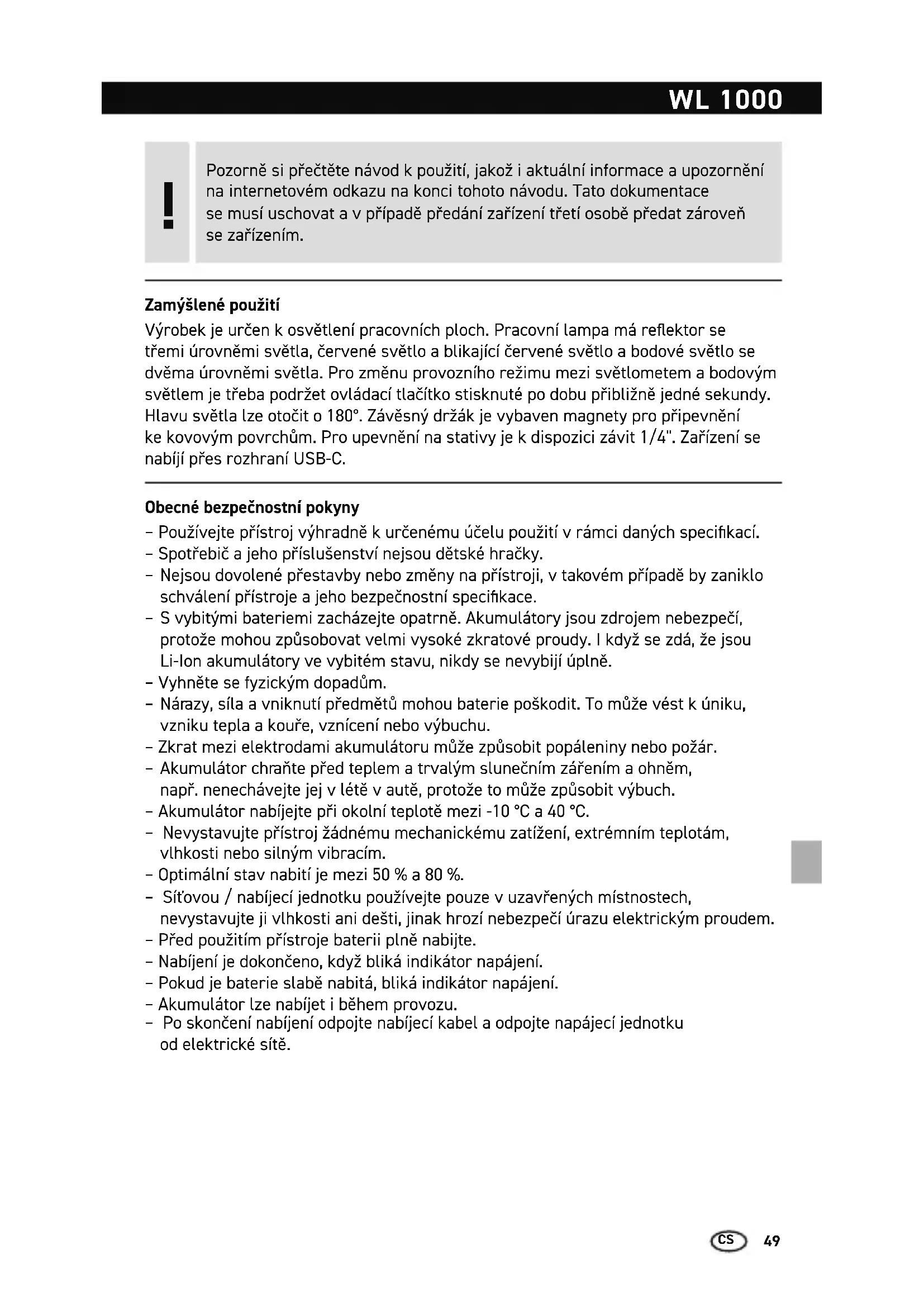Zamýšlené použití Výrobek je určen k osvětlení pracovních ploch. Pracovní lampa má reektor se třemi úrovněmi světla, červené světlo a blikající červené světlo a bodové světlo se dvěma úrovněmi světla. Pro změnu provozního režimu mezi světlometem a bodovým světlem je třeba podržet ovládací tlačítko stisknuté po dobu přibližně jedné sekundy. Hlavu světla lze otočit o 180°. Závěsný držák je vybaven magnety pro připevnění ke kovovým povrchům. Pro upevnění na stativy je k dispozici závit 1/4". Zařízení se nabíjí přes rozhraní USB-C. Obecné bezpečnostní pokyny – Používejte přístroj výhradně k určenému účelu použití v rámci daných specikací. – Spotřebič a jeho příslušenství nejsou dětské hračky.