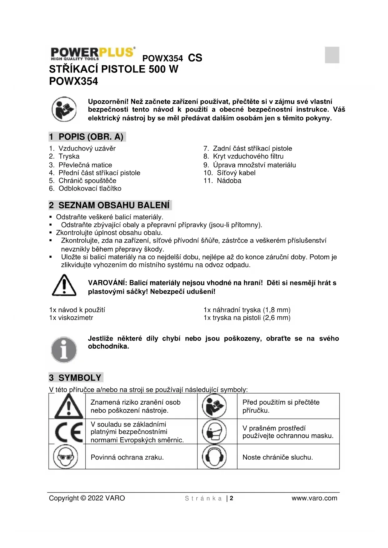 - NESTŘÍKEJTE – nestříkejte materiálem, jehož rizika nejsou známa.POWX354 CS Copyright © 2022 VARO S t r á n k a | 5 www.varo.com