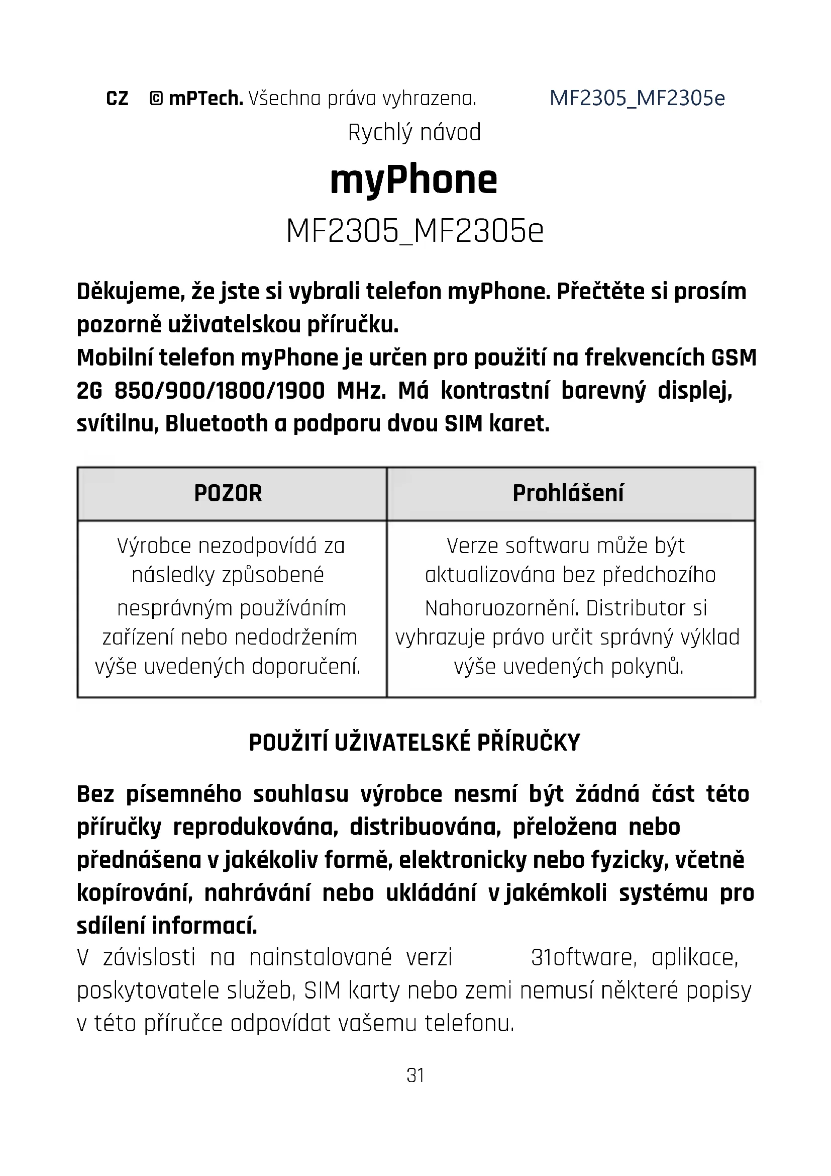 oftware, aplikace, poskytovatele služeb, SIM karty nebo zemi nemusí některé popisy v této příručce odpovídat vašemu telefonu.CZ © mPTech. Všechna práva vyhrazena. MF2305_MF2305e