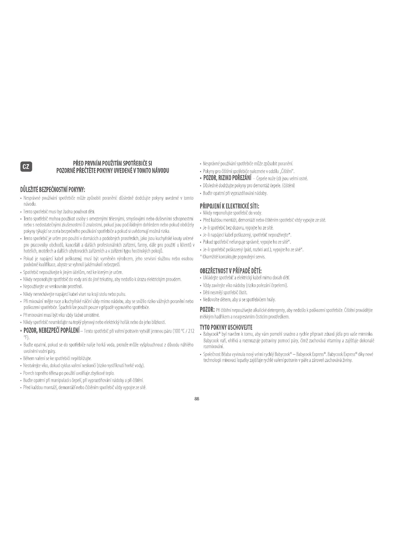 - Společnost Béaba vyvinula nový velmi rychlý Babycook® – Babycook Express®. Babycook Express® díky nové technologii mixovací lopatky zajišťuje rychlé vaření potravin v páře a zároveň zachovává živiny. PŘED PRVNÍM POUŽITÍM SPOTŘEBIČE SI POZORNĚ PŘEČTĚTE POKYNY UVEDENÉ V TOMTO NÁVODU CZb