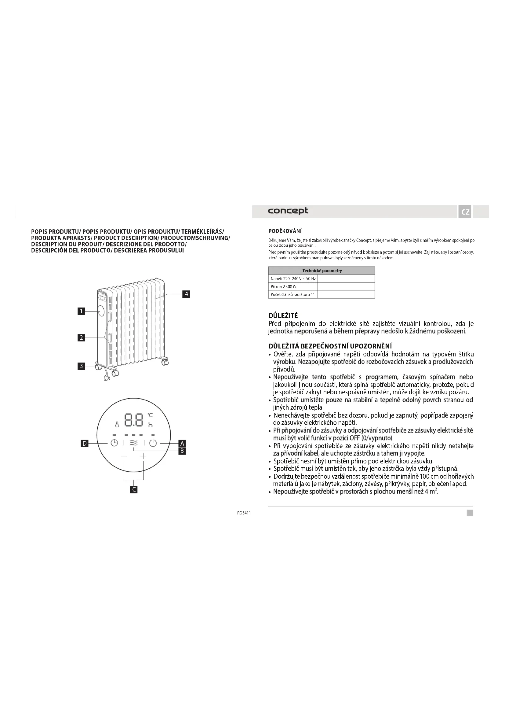 Děkujeme Vám, že jste si zakoupili výrobek značky Concept, a přejeme Vám, abyste byli s naším výrobkem spokojeni po celou dobu jeho používání. Před prvním použitím prostudujte pozorně celý návod k obsluze a potom si jej uschovejte. Zajistěte, aby i ostatní osoby, které budou s výrobkem manipulovat, byly seznámeny s tímto návodem.Technické parametryNapětí 220–240 V ~ 50 HzPříkon 2 300 WPočet článků radiátoru 11 POPIS PRODUKTU/ POPIS PRODUKTU/ OPIS PRODUKTU/ TERMÉKLEÍRÁS/