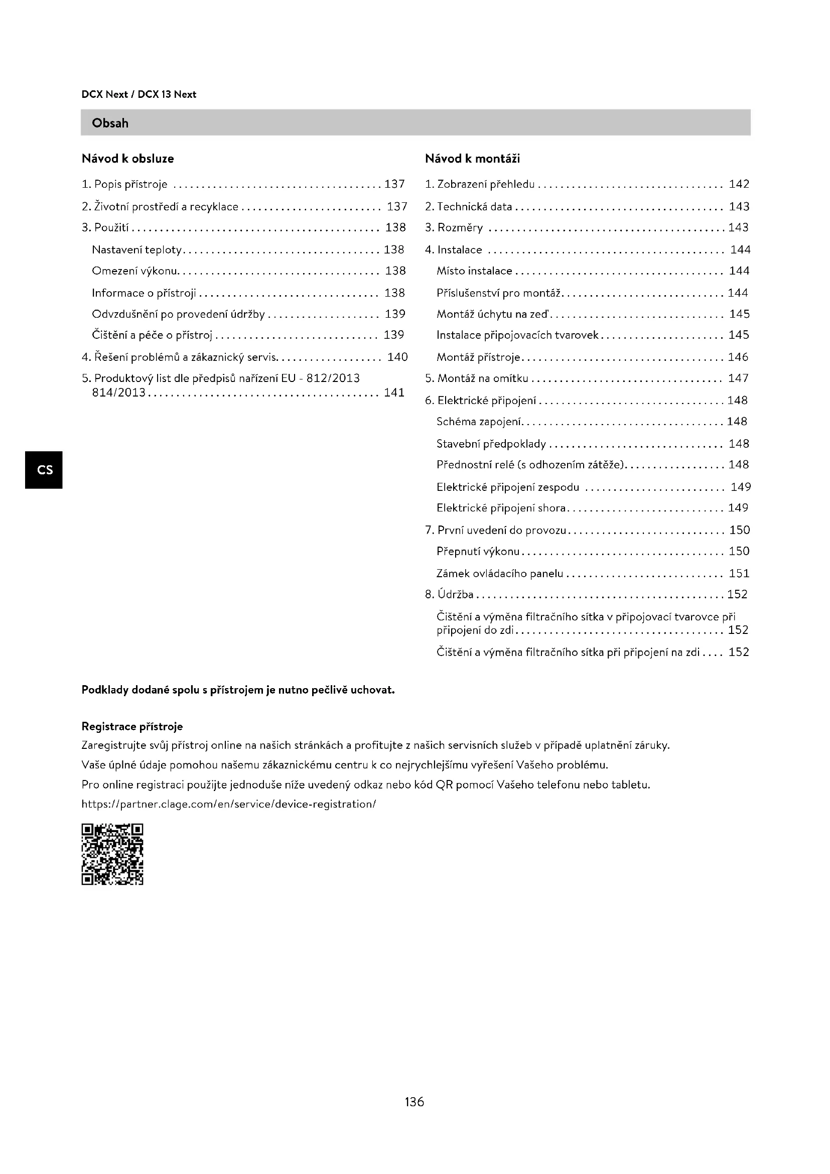 Obsah Registrace přístroje Zaregistrujte svůj přístroj online na našich stránkách a profitujte z našich servisních služeb v případě uplatnění záruky. Vaše úplné údaje pomohou našemu zákaznickému centru k co nejrychlejšímu vyřešení Vašeho problému. Pro online registraci použijte jednoduše níže uvedený odkaz nebo kód QR pomocí Vašeho telefonu nebo tabletu. https://partner.clage.com/en/service/device-registration/