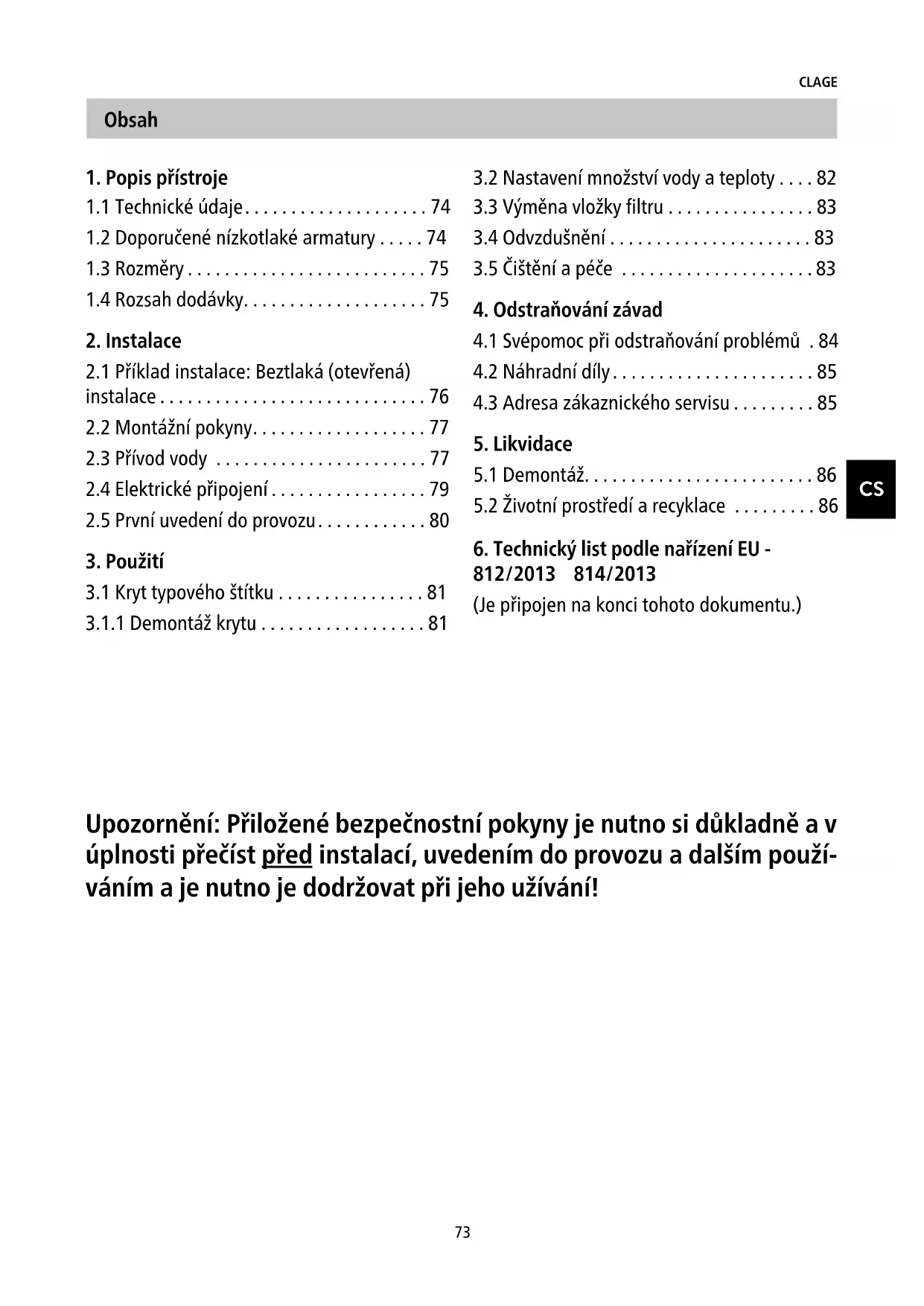CLAGE CZ s.r.o. Trojanovice 644 744 01 Frenštát pod Radhoštěm Česká Republika Tel: +420 596-550 207 E-mail: info@clagecz.cz Internet: www.clagecz.cz Odstraňování závad