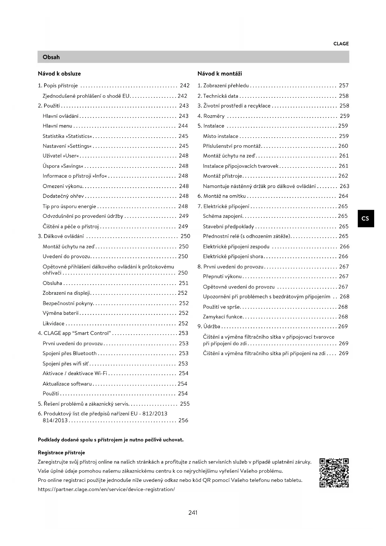 Obsah Podklady dodané spolu s přístrojem je nutno pečlivě uchovat. Registrace přístroje Zaregistrujte svůj přístroj online na našich stránkách a profitujte z našich servisních služeb v případě uplatnění záruky. Vaše úplné údaje pomohou našemu zákaznickému centru k co nejrychlejšímu vyřešení Vašeho problému. Pro online registraci použijte jednoduše níže uvedený odkaz nebo kód QR pomocí Vašeho telefonu nebo tabletu. https://partner.clage.com/en/service/device-registration/ Návod k obsluze . Popis přístroje ..................................... Zjednodušené prohlášení oshodě EU .................. . Použití ............................................ Hlavní ovládání ..................................... Hlavní menu ....................................... Statistika »Statistics« ................................ Nastavení »Settings« ................................ Uživatel »User« ..................................... Úspora »Savings« ................................... Informace o přístroji »Info« .......................... Omezení výkonu. . . . . . . . . . . . . . . . . . . . . . . . . . . . . . . . . . . . Dodatečný ohřev ................................... Tip pro úsporu energie .............................. Odvzdušnění po provedení údržby .................... Čištění a péče o přístroj ............................. . Dálkové ovládání ................................... Montáž úchytu na zeď ............................... Uvedení do provozu ................................. Opětovné přihlášení dálkového ovládání k průtokovému ohřívači ........................................... Obsluha ........................................... Zobrazení na displeji ................................. Bezpečnostní pokyny. . . . . . . . . . . . . . . . . . . . . . . . . . . . . . . . Výměna baterií ..................................... Likvidace .......................................... . CLAGE app “Smart Control” ......................... První uvedení do provozu ............................ Spojení přes Bluetooth .............................. Spojení přes wifi síť ................................. Aktivace / deaktivace Wi-Fi .......................... Aktualizace softwaru ................................ Použití ............................................ . Řešení problémů a zákaznický servis. . . . . . . . . . . . . . . . . . . . Produktový list dle předpisů nařízení EU - / / ......................................... Návod k montáži . Zobrazení přehledu ................................. . Technická data ..................................... . Životní prostředí a recyklace ......................... . Rozměry .......................................... . Instalace .......................................... Místo instalace ..................................... Příslušenství pro montáž ............................. Montáž úchytu na zeď ............................... Instalace připojovacích tvarovek ...................... Montáž přístroje .................................... Namontuje nástěnný držák pro dálkové ovládání ........ . Montáž na omítku .................................. . Elektrické připojení ................................. Schéma zapojení .................................... Stavební předpoklady ............................... Přednostní relé (s odhozením zátěže) .................. Elektrické připojení zespodu ......................... Elektrické připojení shora ............................ . První uvedení do provozu ............................ Přepnutí výkonu .................................... Opětovné uvedení do provozu ....................... Upozornění při problémech s bezdrátovým připojením .. Použití ve sprše ..................................... Zamykací funkce .................................... . Údržba ............................................ Čištění a výměna filtračního sítka v připojovací tvarovce při připojení do zdi .................................. Čištění a výměna filtračního sítka při připojení na zdi ....