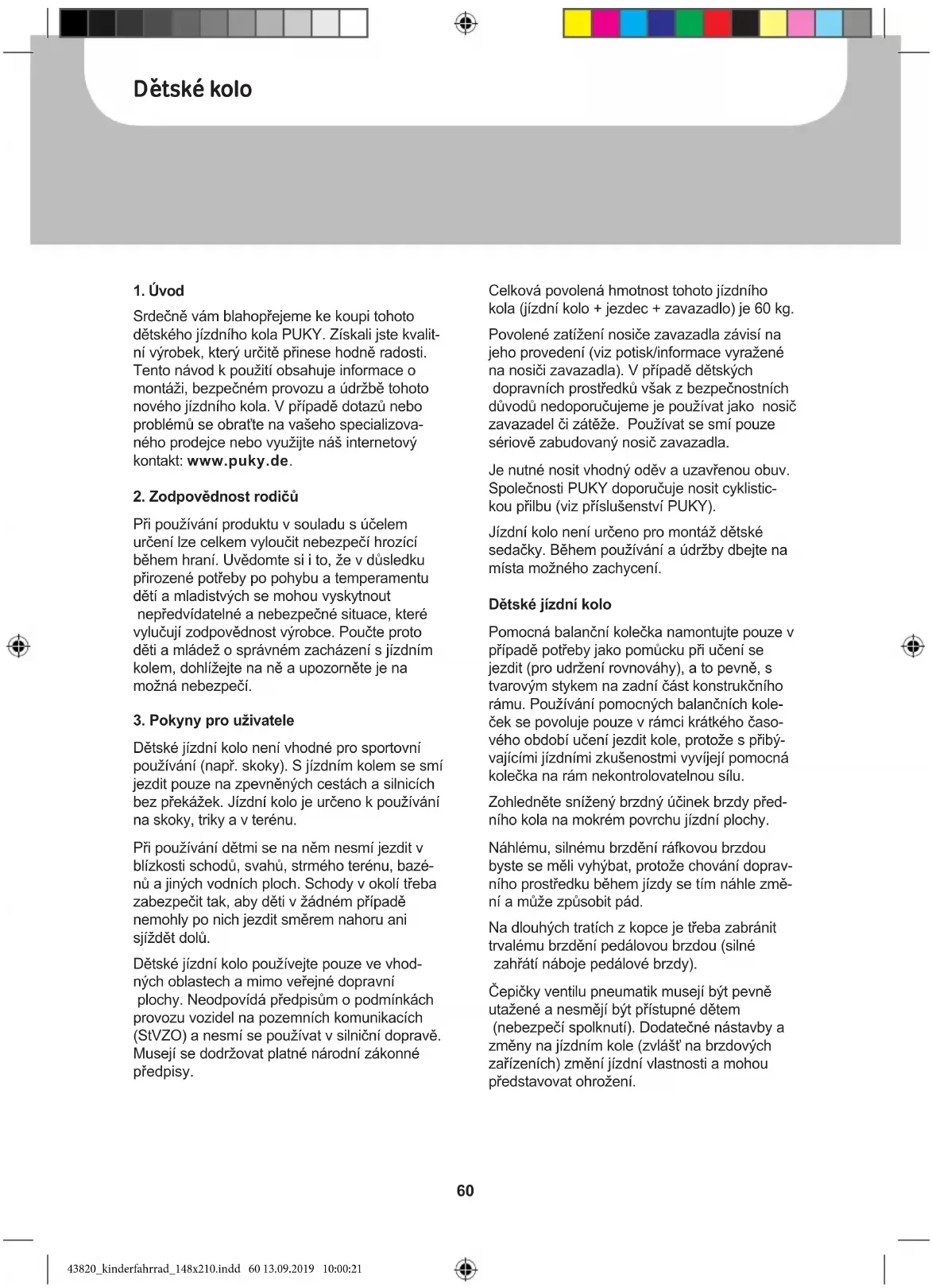 Srdečně vám blahopřejeme ke koupi tohoto dětského jízdního kola PUKY. Získali jste kvalit- ní výrobek, který určitě přinese hodně radosti. Tento návod k použití obsahuje informace o montáži, bezpečném provozu a údržbě tohoto nového jízdního kola. V případě dotazů nebo problémů se obraťte na vašeho specializova- ného prodejce nebo využijte náš internetový kontakt: www.puky.de.