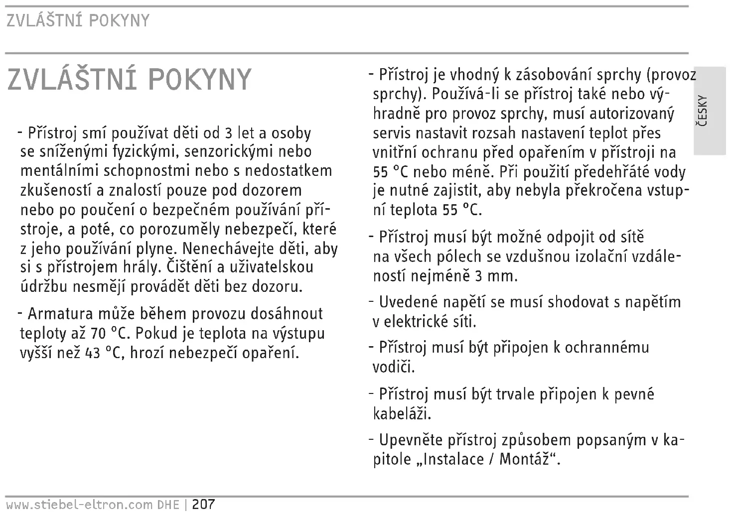 - Přístroj smí používat děti od 3let a osoby se sníženými fyzickými, senzorickými nebo mentálními schopnostmi nebo snedostatkem zkušeností a znalostí pouze pod dozorem nebo po poučení obezpečném používání pří- stroje, a poté, co porozuměly nebezpečí, které zjeho používání plyne. Nenechávejte děti, aby si spřístrojem hrály. Čištění a uživatelskou údržbu nesmějí provádět děti bez dozoru. - Armatura může během provozu dosáhnout teploty až 70°C. Pokud je teplota na výstupu vyšší než 43°C, hrozí nebezpečí opaření. - Přístroj je vhodný k zásobování sprchy (provoz sprchy). Používá-li se přístroj také nebo vý- hradně pro provoz sprchy, musí autorizovaný servis nastavit rozsah nastavení teplot přes vnitřní ochranu před opařením v přístroji na 55°C nebo méně. Při použití předehřáté vody je nutné zajistit, aby nebyla překročena vstup- ní teplota 55°C. - Přístroj musí být možné odpojit odsítě navšech pólech se vzdušnou izolační vzdále- ností nejméně 3mm. - Uvedené napětí se musí shodovat s napětím velektrické síti. - Přístroj musí být připojen k ochrannému vodiči. - Přístroj musí být trvale připojen k pevné kabeláži. - Upevněte přístroj způsobem popsaným vka- pitole „Instalace/ Montáž“.OBSLUHA Všeobecné pokyny 208 | DHE www.stiebel-eltron.com - Dodržujte maximální dovolený tlak (viz ka- pitola „Instalace/ Technické údaje/ Tabulka stechnickými údaji“). - Nesmí být nedosažena hodnota měrného odporu vody z vodovodní sítě (viz kapitola „Instalace / Technické údaje / Tabulka stech- nickými údaji“). - Vypusťte přístroj způsobem podle popisu vkapitole „Instalace/ Údržba/ Vypuštění přístroje“. OBSLUHA