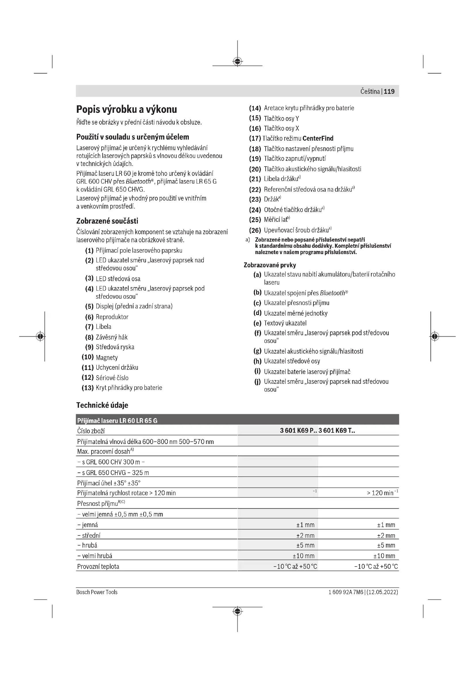 Zobrazené nebo popsané příslušenství nepatří kstandardnímu obsahu dodávky. Kompletní příslušenství naleznete vnašem programu příslušenství. Zobrazované prvky (a) Ukazatel stavu nabití akumulátoru/baterií rotačního laseru (b) Ukazatel spojení přes Bluetooth® (c) Ukazatel přesnosti příjmu (d) Ukazatel měrné jednotky (e) Textový ukazatel (f) Ukazatel směru „laserový paprsek pod středovou osou“ (g) Ukazatel akustického signálu/hlasitosti (h) Ukazatel středové osy (i) Ukazatel baterie laserový přijímač (j) Ukazatel směru „laserový paprsek nad středovou osou“ Technické údaje Přijímač laseru LR 60 LR 65G Číslo zboží 3601K69P.. 3601K69T.. Přijímatelná vlnová délka 600–800nm 500–570nm Max. pracovní dosah