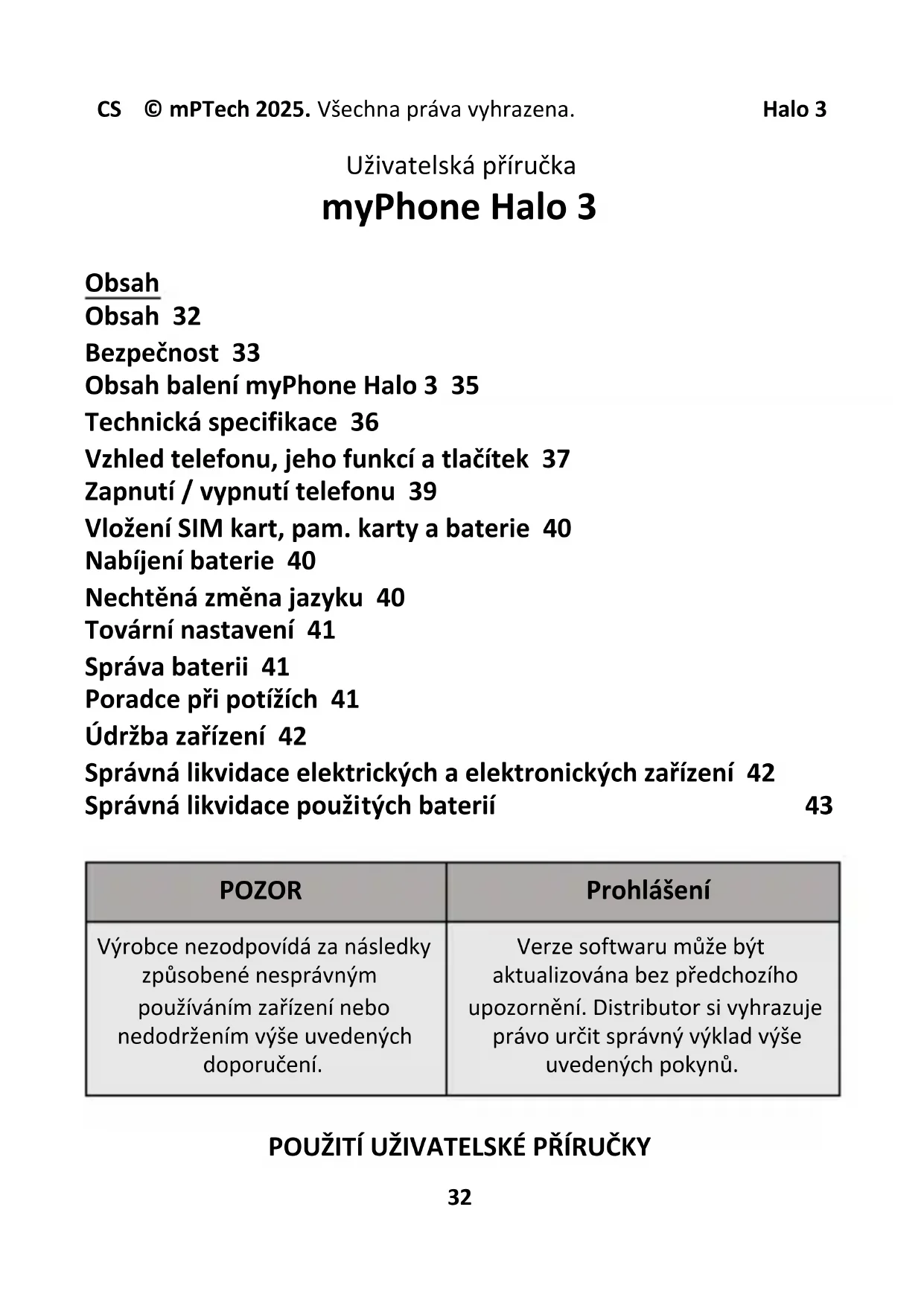 může způsobit výbuch. Nikdy neotvírejte baterii. Baterii likvidujte v souladu s pokyny. Odpojte nepoužívanou nabíječku od elektrické sítě. V případě poškození nabíjecího kabelu se jej nepokoušejte opravovat - měl by být vyměněn za nový. Používejte pouze originální příslušenství od výrobce. —SLUCH— Abyste předešli poškození sluchu, nepoužívejte zařízení dlouhou dobu při vysoké hlasitosti a nedávejte zařízení přímo do ucha. —ZRAK— Aby nedošlo k poškození zraku, nedívejte se do zapnuté diody. Silný paprsek světla může způsobit trvalé poškození očí! Distributor: C.P.A CZECH s.r.o. U Panasonicu 376 530 06 Pardubice, Česká republika Tel: 466 734 110 Webové stránky: www.myphone.cz Producent: mPTech Sp. z o.o. ulice Nowogrodzka 31 00-511 Varšava Polsko www.mptech.eu Obsah balení myPhone Halo 3 Doporučujeme uchovat obal pro případ reklamace. Uchovávejte balení mimo dosah dětí. Z důvodu ochrany životního prostředí není v balení obsažena nabíječka. Toto zařízení lze napájet pomocí většiny USB napájecích zdrojů a kabelu s konektorem USB typu C.CS © mPTech 2025. Všechna práva vyhrazena. Halo 3