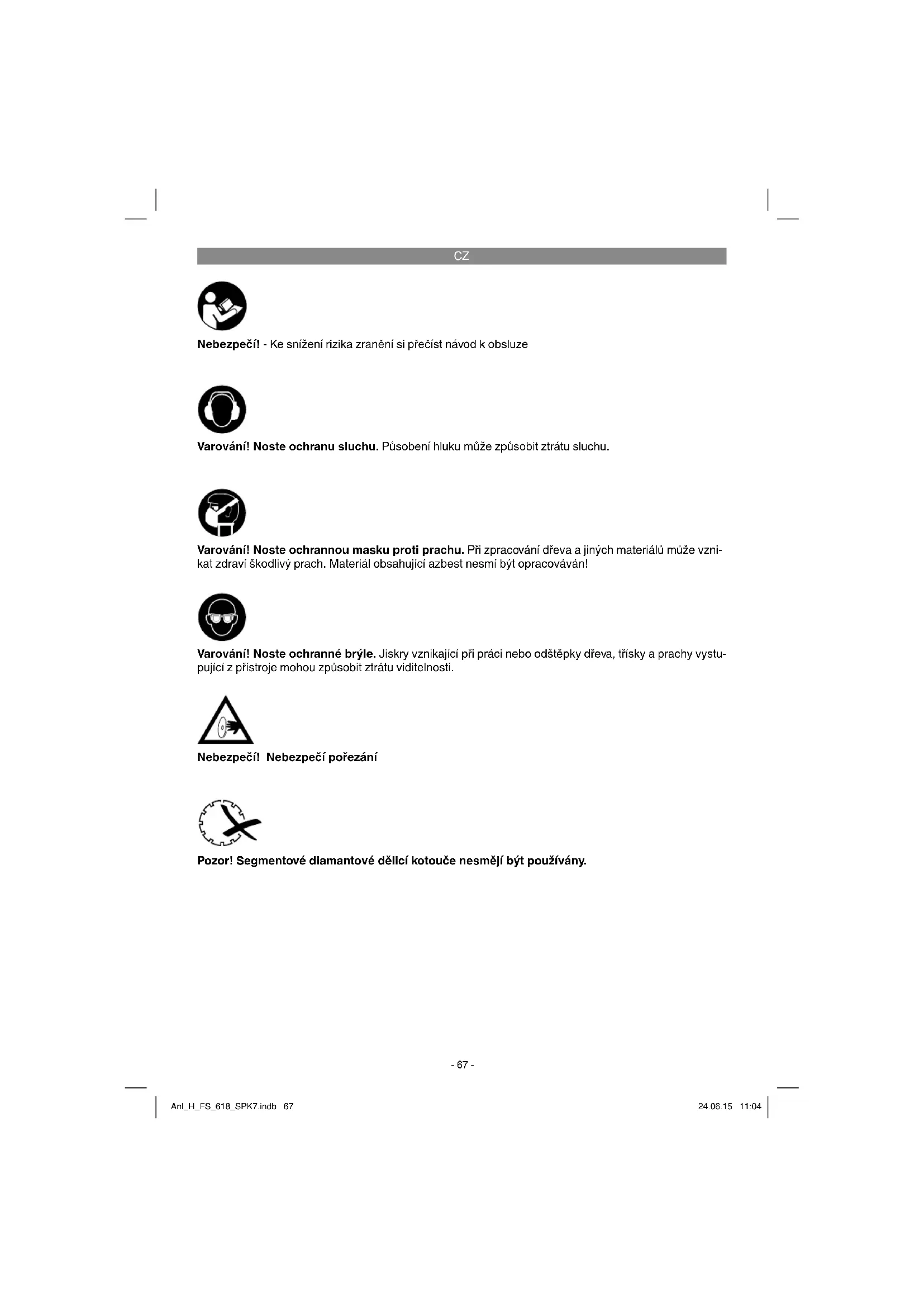 Nebezpečí! Nebezpečí pořezání Pozor! Segmentové diamantové dělicí kotouče nesmějí být používány. Nebezpečí! - Ke snížení rizika zranění si přečíst návod k obsluze Varování! Noste ochranu sluchu. Působení hluku může způsobit ztrátu sluchu. Varování! Noste ochranné brýle. Jiskry vznikající při práci nebo odštěpky dřeva, třísky a prachy vystu- pující z přístroje mohou způsobit ztrátu viditelnosti. Varování! Noste ochrannou masku proti prachu. Při zpracování dřeva a jiných materiálů může vzni- kat zdraví škodlivý prach. Materiál obsahující azbest nesmí být opracováván! Anl_H_FS_618_SPK7.indb 67Anl_H_FS_618_SPK7.indb 67 24.06.15 11:0424.06.15 11:04CZ