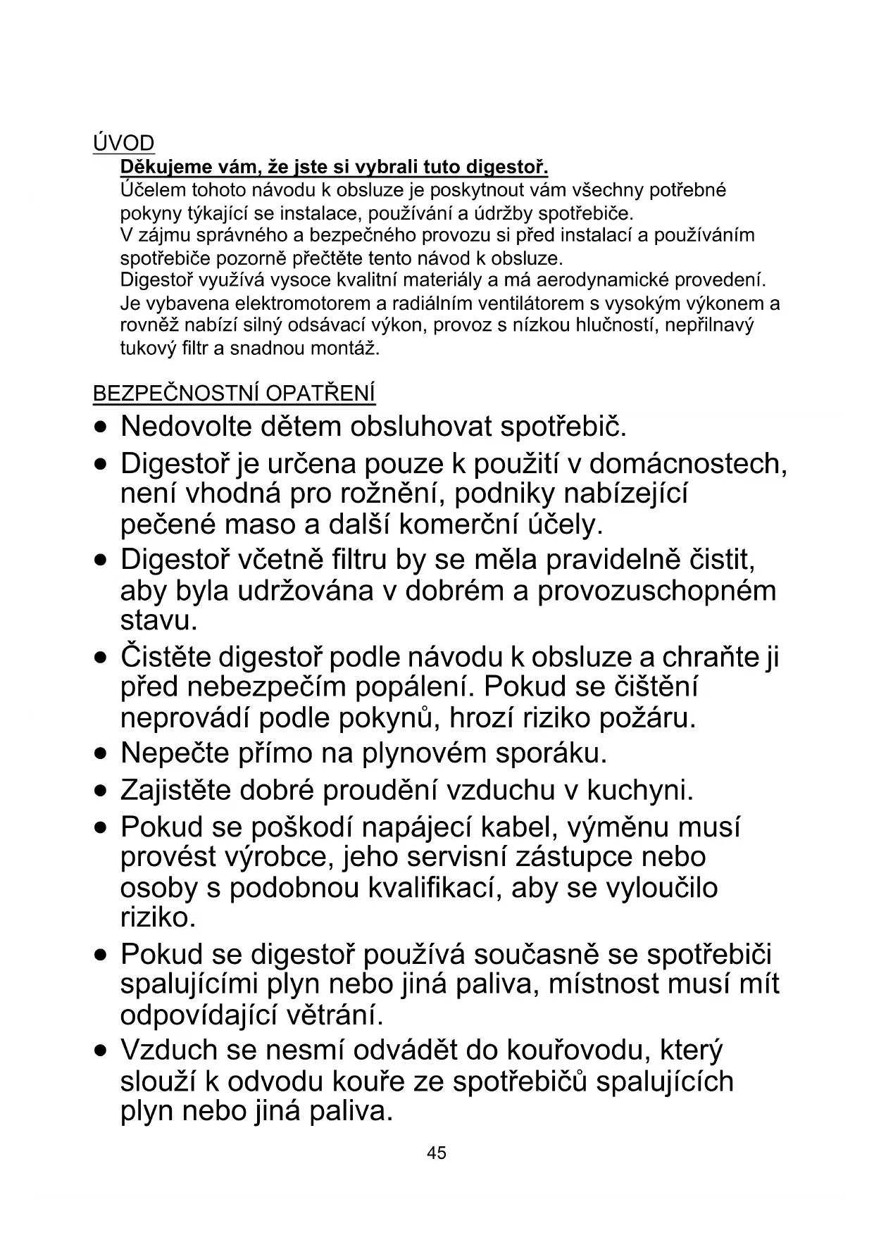 44ÚVOD Děkujeme vám, že jste si vybrali tuto digestoř. Účelem tohoto návodu k obsluze je poskytnout vám všechny potřebné pokyny týkající se instalace, používání a údržby spotřebiče. V zájmu správného a bezpečného provozu si před instalací a používáním spotřebiče pozorně přečtěte tento návod k obsluze. Digestoř využívá vysoce kvalitní materiály a má aerodynamické provedení. Je vybavena elektromotorem a radiálním ventilátorem s vysokým výkonem a rovněž nabízí silný odsávací výkon, provoz s nízkou hlučností, nepřilnavý tukový filtr a snadnou montáž.