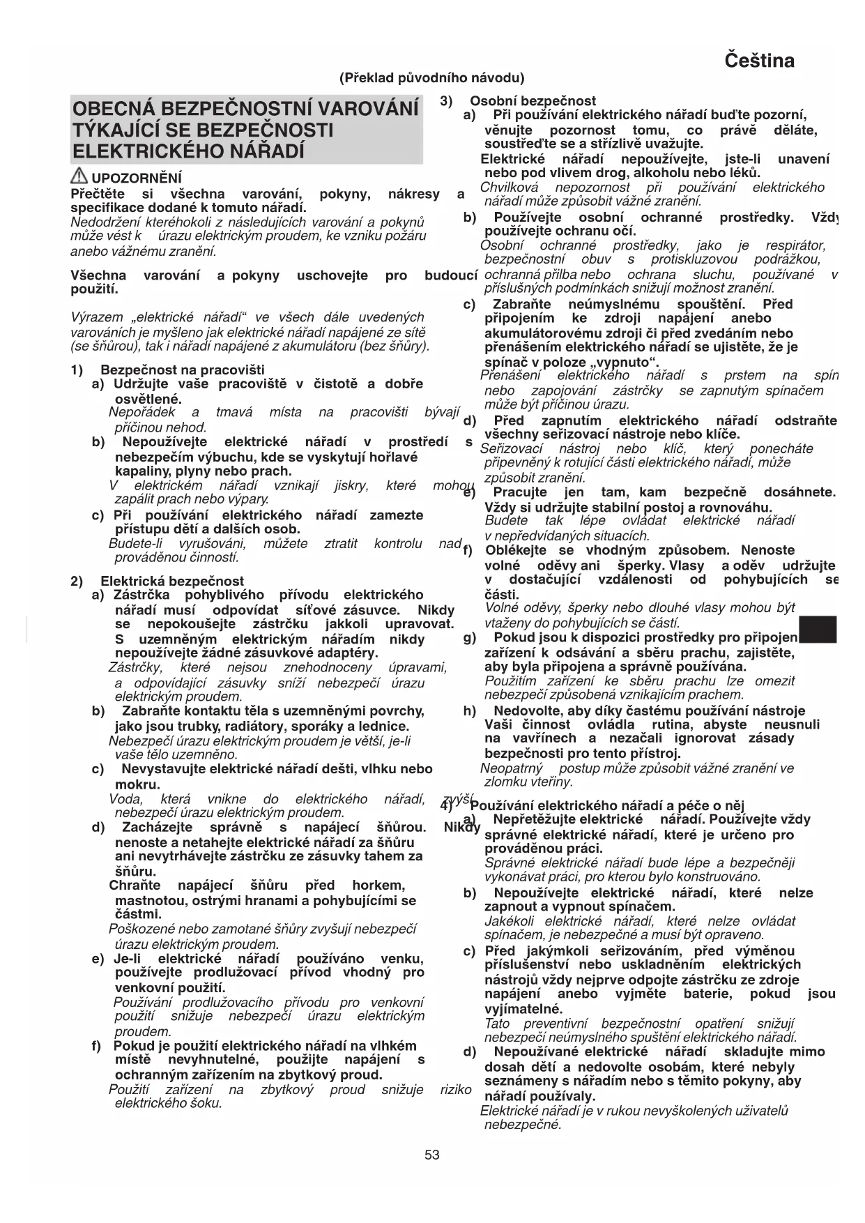 UPOZORNĚNÍ Přečtěte si všechna varování, pokyny, nákresy a specikacedodanéktomutonářadí. Nedodržení kteréhokoliz následujících varování a pokynů můževéstk úrazuelektrickýmproudem,kevznikupožáru anebovážnémuzranění. Všechna varování a pokyny uschovejte pro budoucí použití. Výrazem „elektrické nářadí“ ve všech dále uvedených varováníchjemyšlenojakelektrickénářadínapájenézesítě (sešňůrou),takinářadínapájenézakumulátoru(bezšňůry).