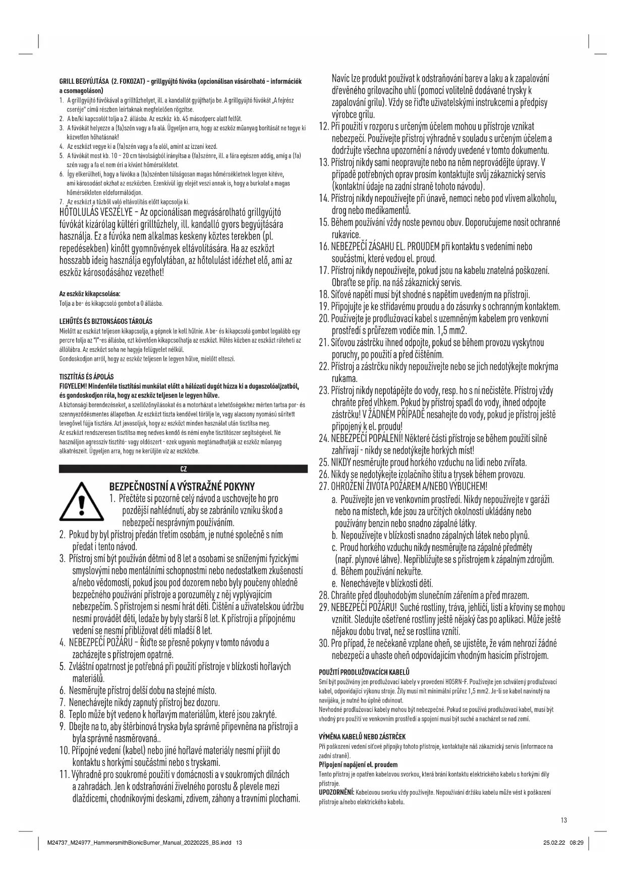 Smí být používány jen prodlužovací kabely v provedení H05RN-F. Používejte jen schválený prodlužovací kabel, odpovídající výkonu stroje. Žíly musí mít minimální průřez 1,5 mm2. Je-li se kabel navinutý na navijáku, je nutné ho úplně odvinout. Nevhodné prodlužovací kabely mohou být nebezpečné. Pokud se používá prodlužovací kabel, musí být vhodný pro použití ve venkovním prostředí a spojení musí být suché a nacházet se nad zemí. VÝMĚNA KABELŮ NEBO ZÁSTRČEK Při poškození vedení síťové přípojky tohoto přístroje, kontaktujte náš zákaznický servis (informace na zadní straně). Připojení napájení el. proudem Tento přístroj je opatřen kabelovou svorkou, která brání kontaktu elektrického kabelu s horkými díly přístroje. UPOZORNĚNÍ: Kabelovou svorku vždy používejte. Nepoužívání držáku kabelu může vést k poškození přístroje a/nebo elektrického kabelu. M24737_M24977_HammersmithBionicBurner_Manual_20220225_BS.indd 13M24737_M24977_HammersmithBionicBurner_Manual_20220225_BS.indd 13 25.02.22 08:2925.02.22 08:2914 POUŽÍVÁNÍ KABELOVÉ SVORKY (#2) Prostrčte kabel otvorem v rukojeti. Vytvořte přitom kabelem smyčku. Veďte kabel kolem kabelové svorky a kabel utáhněte. PŘED PRVNÍM POUŽITÍM Odstraňte veškerý obalový materiál. Obalový materiál zlikvidujte. Všechny dodané díly dobře uschovejte. Zkontrolujte, zda jsou obsaženy všechny díly uvedené v obsahu dodávky. Pokud by některé díly chyběly nebo byly vadné, kontaktujte prosím náš zákaznický servis (kontaktní údaje na zadní straně). NAMONTUJTE PRODLUŽOVACÍ TYČ & RUKOJEŤ (#3) Při obdržení přístroje ještě nejsou prodlužovací tyč a rukojeť namontované. Při jejich montáži postupujte následovně: