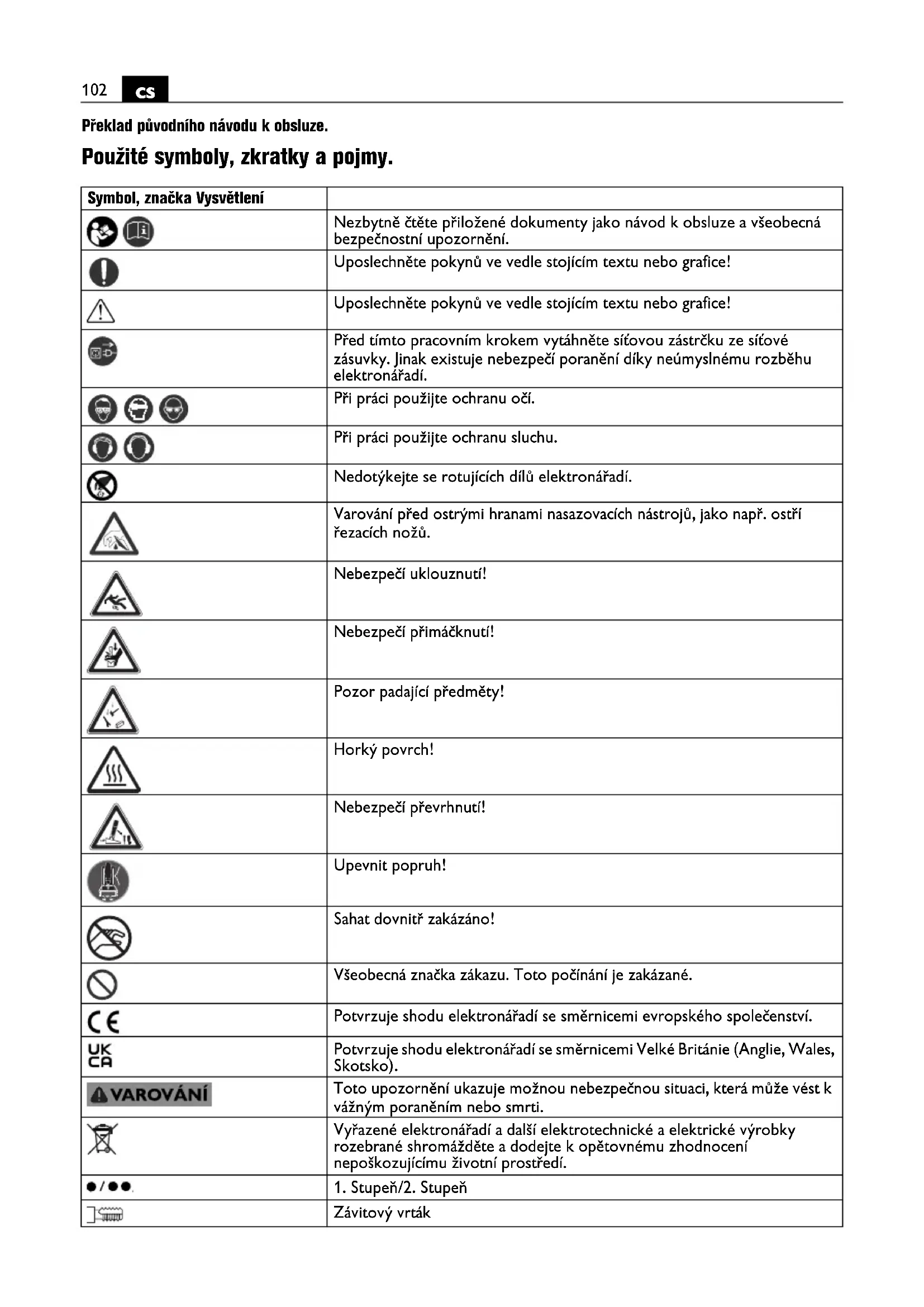 Překlad původního návodu k obsluze. Použité symboly, zkratky a pojmy. Symbol, značka Vysvětlení Nezbytně čtěte přiložené dokumenty jako návod k obsluze a všeobecná bezpečnostní upozornění. Uposlechněte pokynů ve vedle stojícím textu nebo grafice! Uposlechněte pokynů ve vedle stojícím textu nebo grafice! Před tímto pracovním krokem vytáhněte síťovou zástrčku ze síťové zásuvky. Jinak existuje nebezpečí poranění díky neúmyslnému rozběhu elektronářadí. Při práci použijte ochranu očí. Při práci použijte ochranu sluchu. Nedotýkejte se rotujících dílů elektronářadí. Varování před ostrými hranami nasazovacích nástrojů, jako např. ostří řezacích nožů. Nebezpečí uklouznutí! Nebezpečí přimáčknutí! Pozor padající předměty! Horký povrch! Nebezpečí převrhnutí! Upevnit popruh! Sahat dovnitř zakázáno! Všeobecná značka zákazu. Toto počínání je zakázané. Potvrzuje shodu elektronářadí se směrnicemi evropského společenství. Potvrzuje shodu elektronářadí se směrnicemi Velké Británie (Anglie, Wales, Skotsko). Toto upozornění ukazuje možnou nebezpečnou situaci, která může vést k vážným poraněním nebo smrti. Vyřazené elektronářadí a další elektrotechnické a elektrické výrobky rozebrané shromážděte a dodejte k opětovnému zhodnocení nepoškozujícímu životní prostředí.