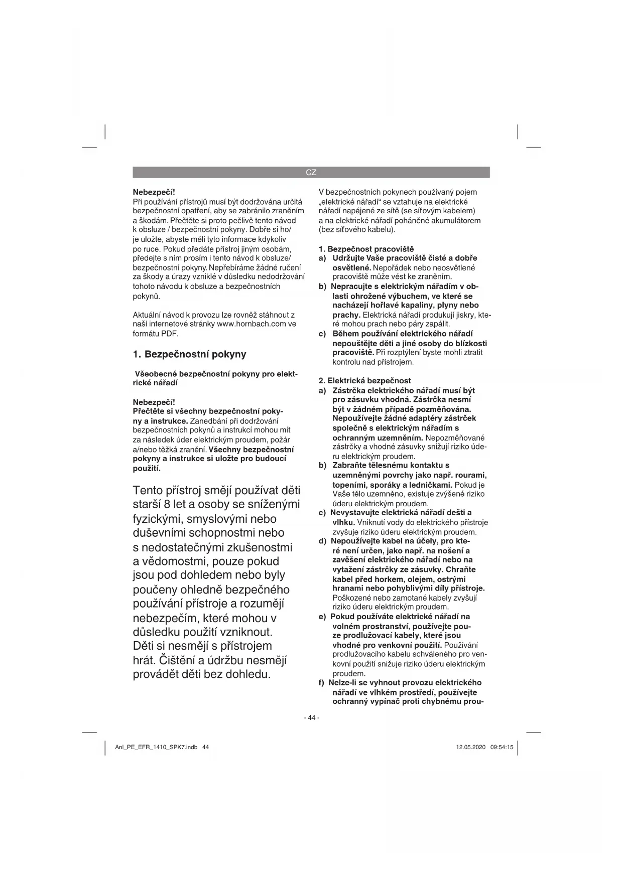 a) Zástrčka elektrického nářadí musí být pro zásuvku vhodná. Zástrčka nesmí být v žádném případě pozměňována. Nepoužívejte žádné adaptéry zástrček společně s elektrickým nářadím s ochranným uzemněním. Nepozměňované zástrčky a vhodné zásuvky snižují riziko úde- ru elektrickým proudem. b) Zabraňte tělesnému kontaktu s uzemněnými povrchy jako např. rourami, topeními, sporáky a ledničkami. Pokud je Vaše tělo uzemněno, existuje zvýšené riziko úderu elektrickým proudem. c) Nevystavujte elektrická nářadí dešti a vlhku. Vniknutí vody do elektrického přístroje zvyšuje riziko úderu elektrickým proudem. d) Nepoužívejte kabel na účely, pro kte- ré není určen, jako např. na nošení a zavěšení elektrického nářadí nebo na vytažení zástrčky ze zásuvky. Chraňte kabel před horkem, olejem, ostrými hranami nebo pohyblivými díly přístroje. Poškozené nebo zamotané kabely zvyšují riziko úderu elektrickým proudem. e) Pokud používáte elektrické nářadí na volném prostranství, používejte pou- ze prodlužovací kabely, které jsou vhodné pro venkovní použití. Používání prodlužovacího kabelu schváleného pro ven- kovní použití snižuje riziko úderu elektrickým proudem. f) Nelze-li se vyhnout provozu elektrického nářadí ve vlhkém prostředí, používejte ochranný vypínač proti chybnému prou- Anl_PE_EFR_1410_SPK7.indb 44Anl_PE_EFR_1410_SPK7.indb 44 12.05.2020 09:54:1512.05.2020 09:54:15CZ