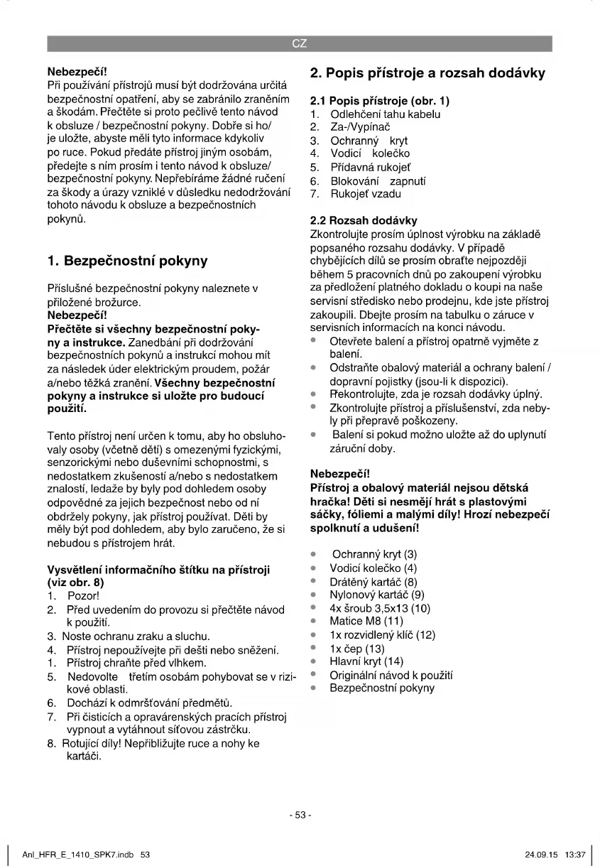 Před zapnutím se přesvědčte, zda údaje na typo- vém štítku souhlasí s údaji sítě. Varování! Než začnete na přístroji provádět nastavení, vždy vytáhněte síťovou zástrčku ze zásuvky. Horní díl krytu (obr. 3a / pol. A) a dolní díl krytu (obr. 3a / pol. B) sestavte a na obou stranách je sešroubujte pomocí vždy jednoho šroubu (obr. 3b / pol. 10). Vodicí kolečko (obr. 4 / pol. 4) zasuňte do vedení v krytu (obr. 4 / pol. A). Přitom dbejte na slyšitelné zacvaknutí! Ochranný kryt (obr. 5 / pol. 3) nasaďte tak, jak je Anl_HFR_E_1410_SPK7.indb 54Anl_HFR_E_1410_SPK7.indb 54 24.09.15 13:3724.09.15 13:37CZ