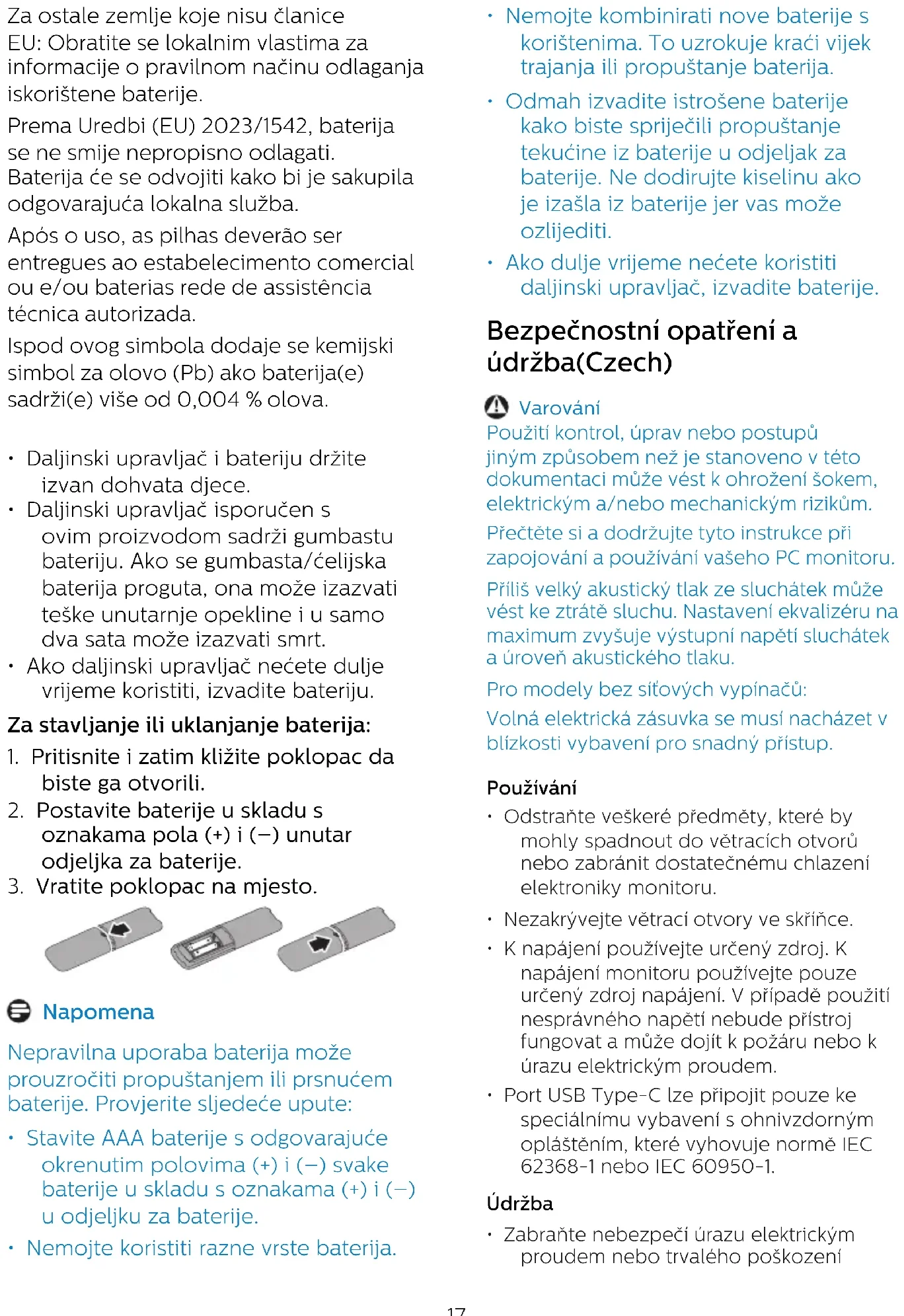 - Ako dulje vrijeme nećete koristiti daljinski upravljač, izvadite baterije. Bezpečnostní opatření a údržba(Czech) Varování Použití kontrol, úprav nebo postupů jiným způsobem než je stanoveno v této dokumentaci může vést k ohrožení šokem, elektrickým a/nebo mechanickým rizikům. Přečtěte si a dodržujte tyto instrukce při zapojování a používání vašeho PC monitoru. Příliš velký akustický tlak ze sluchátek může vést ke ztrátě sluchu. Nastavení ekvalizéru na maximum zvyšuje výstupní napětí sluchátek a úroveň akustického tlaku. Pro modely bez síťových vypínačů: Volná elektrická zásuvka se musí nacházet v blízkosti vybavení pro snadný přístup. Používání