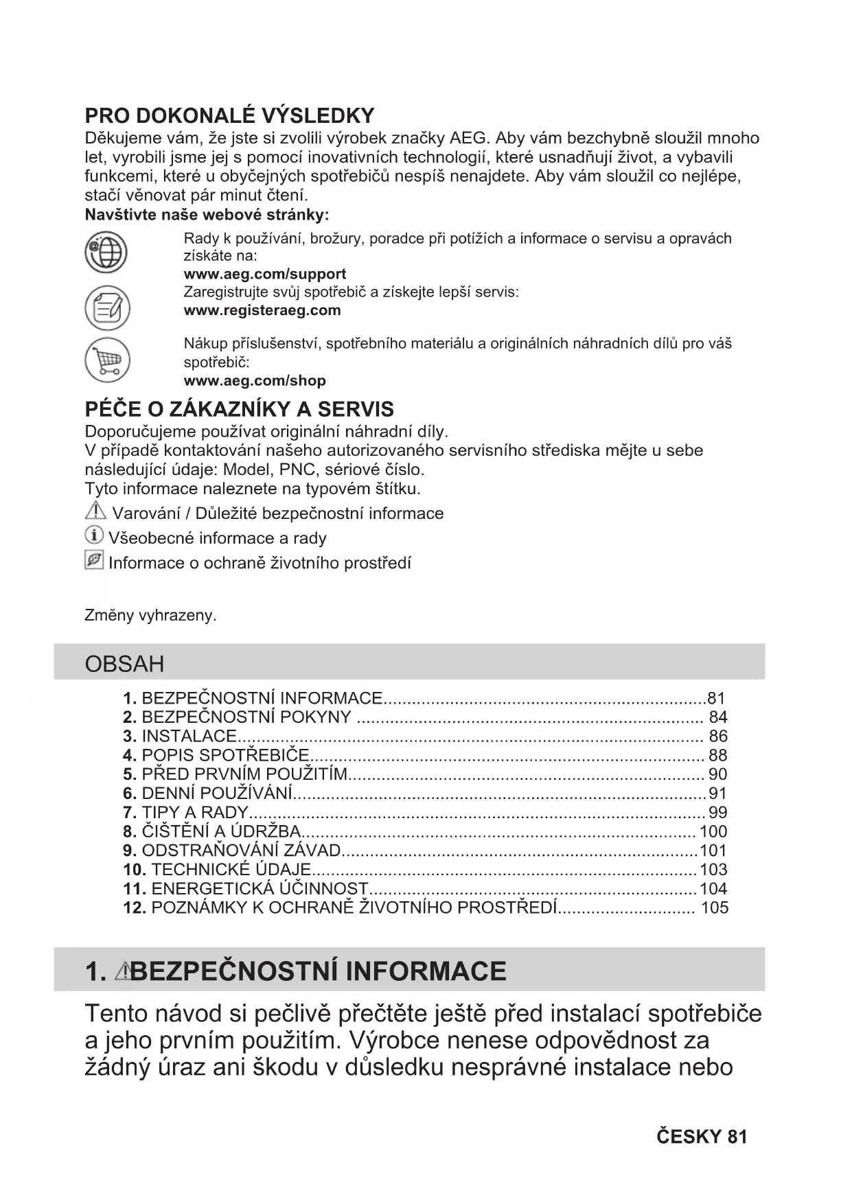 Děkujeme vám, že jste si zvolili výrobek značky AEG. Aby vám bezchybně sloužil mnoholet, vyrobili jsme jej s pomocí inovativních technologií, které usnadňují život, a vybavilifunkcemi, které u obyčejných spotřebičů nespíš nenajdete. Aby vám sloužil co nejlépe,stačí věnovat pár minut čtení.Navštivte naše webové stránky:Rady k používání, brožury, poradce při potížích a informace o servisu a opraváchzískáte na:www.aeg.com/supportZaregistrujte svůj spotřebič a získejte lepší servis:www.registeraeg.comNákup příslušenství, spotřebního materiálu a originálních náhradních dílů pro vášspotřebič:www.aeg.com/shop PÉČE O ZÁKAZNÍKY A SERVIS Doporučujeme používat originální náhradní díly.V případě kontaktování našeho autorizovaného servisního střediska mějte u sebenásledující údaje: Model, PNC, sériové číslo.Tyto informace naleznete na typovém štítku. Varování / Důležité bezpečnostní informace Všeobecné informace a rady Informace o ochraně životního prostředíZmĕny vyhrazeny. OBSAH