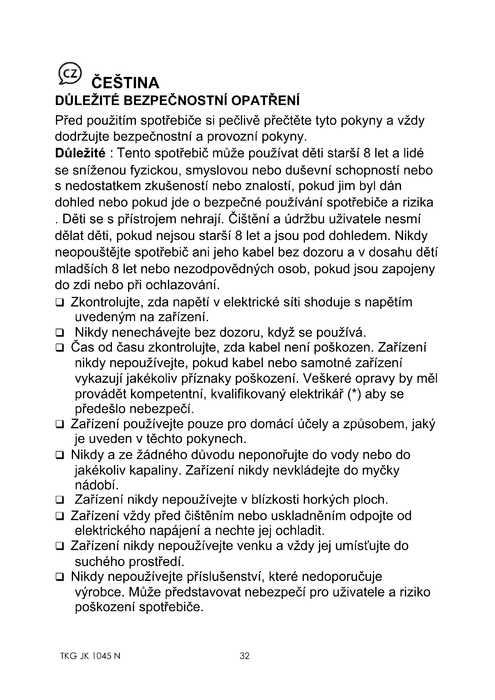 ❑ Zařízení nikdy nepřemisťujte taháním za kabel. Ujistěte se, že kabel se žádným způsobem nemůže někde zachytit. Umístěte přístroj, příp. podstavec na rovnou, stabilní plochu. Neomotávejte kabel kolem zařízení ani jej neohýbejte. ❑ Pokud je Váš přístroj vybaven samostatným podstavcem nebo odnímatelným kabelem, před plněním konvice vodou tyto díly od ní oddělte. Pokud má Vaše konvice pevně připevněn kabel, vytáhněte nejprve zástrčku ze zásuvky, než konvici naplníte vodou. ❑ Dbejte na to, aby byla konvice naplněna mezi body označujícími minimum a maximum. Vždy zkontrolujte, zda není úroveň vody pod označenou hranicí minima, což by mohlo vést k poškození vyhřívacího prvku. Pozor! Pokud přeplníte konvici příliš velkým množstvím vody, může překypět a horká voda z ní bude šplouchat ven. ❑ Při používání přístroje má být víko řádně zavřené. Víko otevřete až tehdy, když se konvice sama vypne. ❑ Dávejte pozor, abyste se nepopálili, při vaření může z konvice unikat horká pára. ❑ Pokud je Váš přístroj vybaven samostatným podstavcem, používejte rychlovarnou konvici pouze s tímto podstavcem. ❑ Pokud se nachází symbol na určité ploše, znamená to, že plocha se během provozu zahřeje a je velmi horká. (*) Kompetentní kvalifikovaný elektrikář: poprodejní oddělení výrobce nebo dovozce nebo jakákoli osoba, která je kvalifikovaná, schválena a kompetentní k provádění takových oprav s cílem předcházení jakýmkoli nebezpečím. V každém případě byste měli vrátit zařízení takovému elektrikáři.TKG JK 1045 N