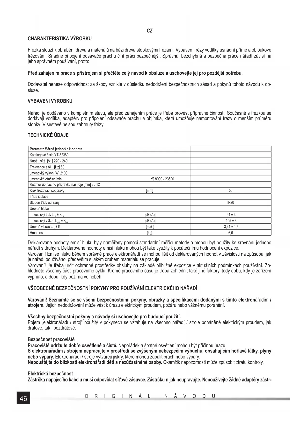 Nářadí je dodáváno v kompletním stavu, ale před zahájením práce je třeba provést přípravné činnosti. Současně s frézkou se dodávají vodítka, adaptéry pro připojení odsavače prachu a objímka, která umožňuje namontování frézy o menším průměru stopky. V sestavě nejsou zahrnuty frézy. TECHNICKÉ ÚDAJE Parametr Měrná jednotka Hodnota Katalogové číslo YT-82380 Napětí sítě [V~] 220 - 240 Frekvence sítě [Hz] 50 Jmenovitý výkon [W] 2100 Jmenovité otáčky [min