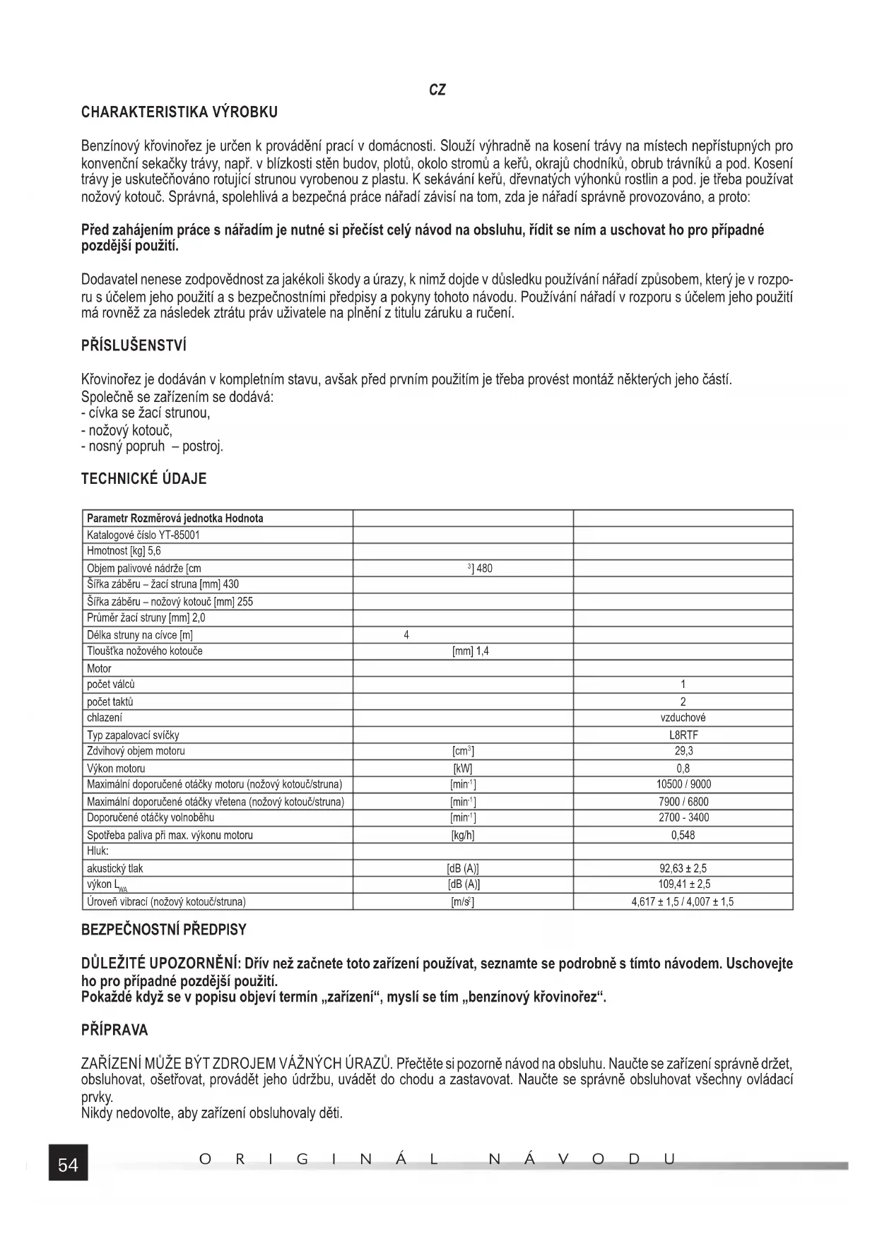 Křovinořez je dodáván v kompletním stavu, avšak před prvním použitím je třeba provést montáž některých jeho částí. Společně se zařízením se dodává: - cívka se žací strunou, - nožový kotouč, - nosný popruh – postroj. TECHNICKÉ ÚDAJE Parametr Rozměrová jednotka Hodnota Katalogové číslo YT-85001 Hmotnost [kg] 5,6 Objem palivové nádrže [cm