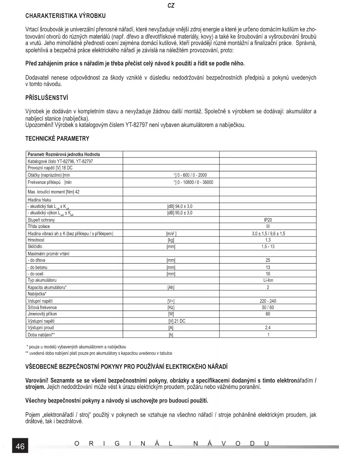 - pouze u modelů vybavených akumulátorem a nabíječkou ** uvedená doba nabíjení platí pouze pro akumulátory s kapacitou uvedenou v tabulce VŠEOBECNÉ BEZPEČNOSTNÍ POKYNY PRO POUŽÍVÁNÍ ELEKTRICKÉHO NÁŘADÍ Varování! Seznamte se se všemi bezpečnostními pokyny, obrázky a specifi kacemi dodanými s tímto elektronářadím / strojem. Jejich nedodržování může vést k úrazu elektrickým proudem, požáru nebo vážnému poranění. Všechny bezpečnostní pokyny a návody si uschovejte pro budoucí použití. Pojem „elektronářadí / stroj“ použitý v pokynech se vztahuje na všechno nářadí / stroje poháněné elektrickým proudem, jak drátové, tak i bezdrátové.47