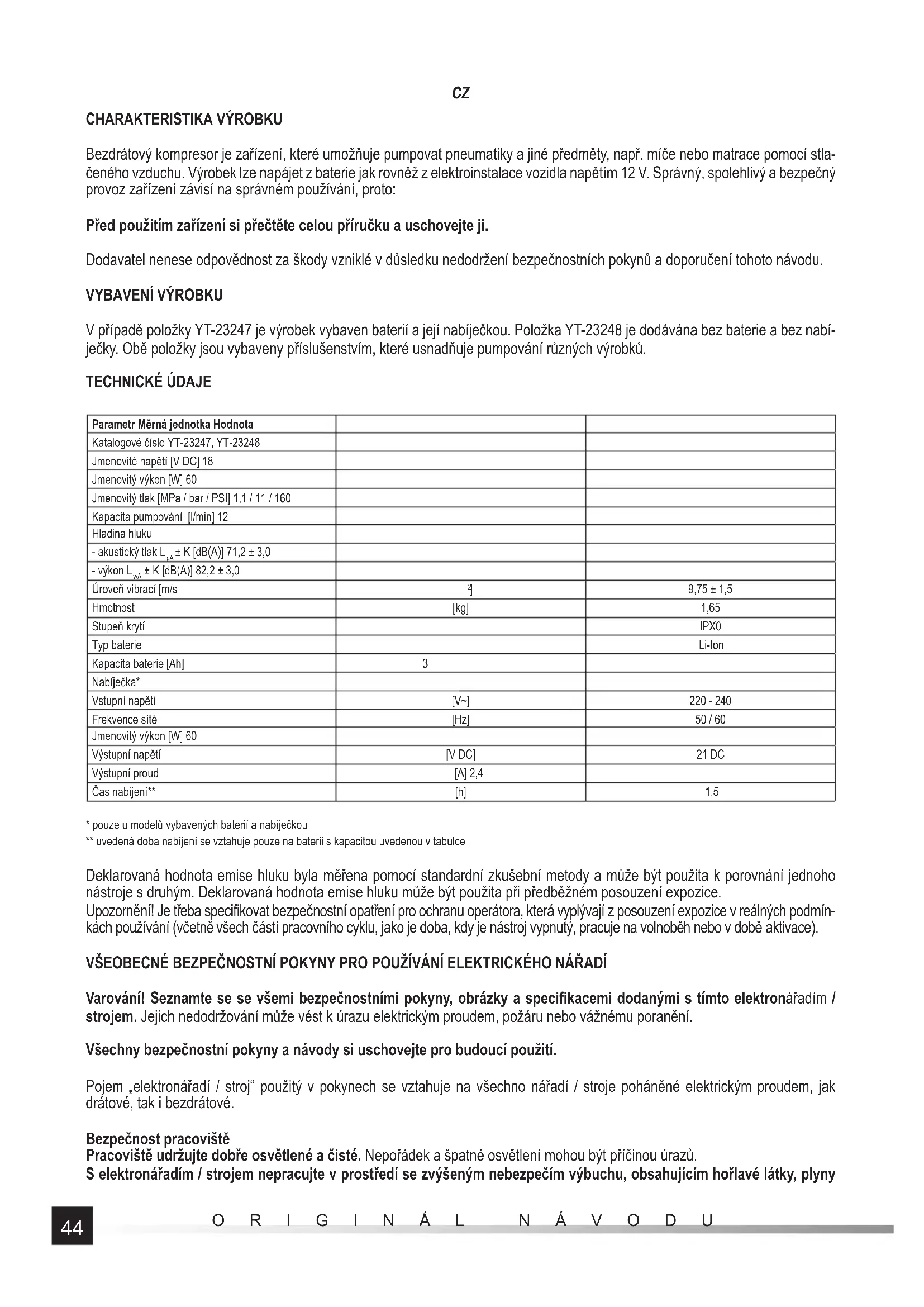 V případě položky YT-23247 je výrobek vybaven baterií a její nabíječkou. Položka YT-23248 je dodávána bez baterie a bez nabí- ječky. Obě položky jsou vybaveny příslušenstvím, které usnadňuje pumpování různých výrobků. TECHNICKÉ ÚDAJE Parametr Měrná jednotka Hodnota Katalogové číslo YT-23247, YT-23248 Jmenovité napětí [V DC] 18 Jmenovitý výkon [W] 60 Jmenovitý tlak [MPa / bar / PSI] 1,1 / 11 / 160 Kapacita pumpování [l/min] 12 Hladina hluku - akustický tlak L