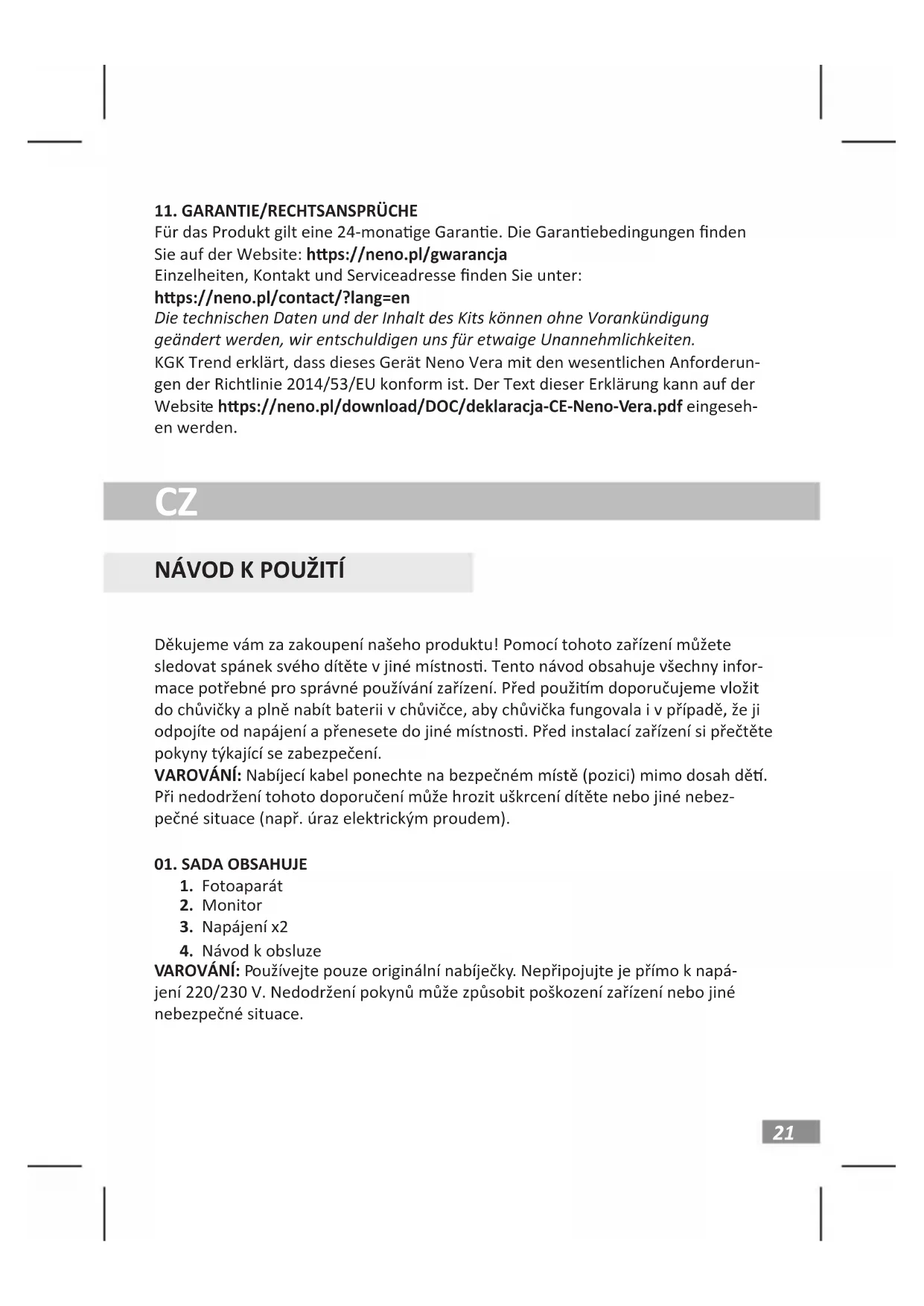 Na výrobek se vztahuje záruka 24 měsíců. Záruční podmínky jsou k dispozici na webových stránkách: hps://neno.pl/gwarancja. Podrobnos, kontaktní údaje a adresu služeb naleznete na adrese: hps://neno.pl/contact/?lang=en. Specikace a obsah sady se mohou změnit bez předchozího upozornění, omlouváme se za případné nepříjemnos. Společnost KGK Trend prohlašuje, že toto zařízení Neno Vera splňuje významné požadavky směrnice 2014/53/EU. Text tohoto prohlášení naleznete na webových stránkách: hps://neno.pl/download/DOC/deklaracja-CE-Neno-Vera.pdf.27