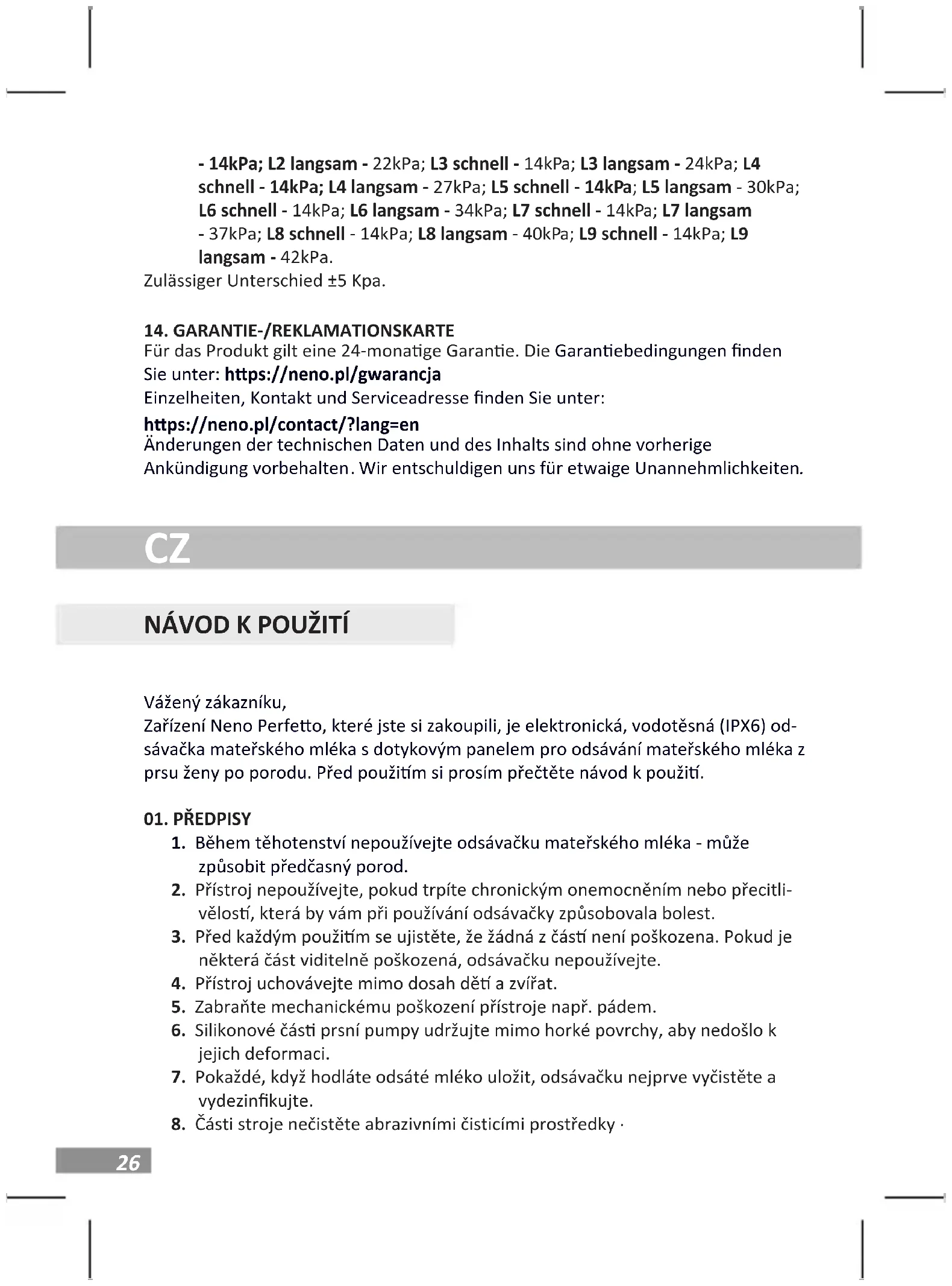 Wir entschuldigen uns für etwaige Unannehmlichkeiten. Vážený zákazníku, Zařízení Neno Perfeo, které jste si zakoupili, je elektronická, vodotěsná (IPX6) od- sávačka mateřského mléka s dotykovým panelem pro odsávání mateřského mléka z prsu ženy po porodu. Před použim si prosím přečtěte návod k použi.