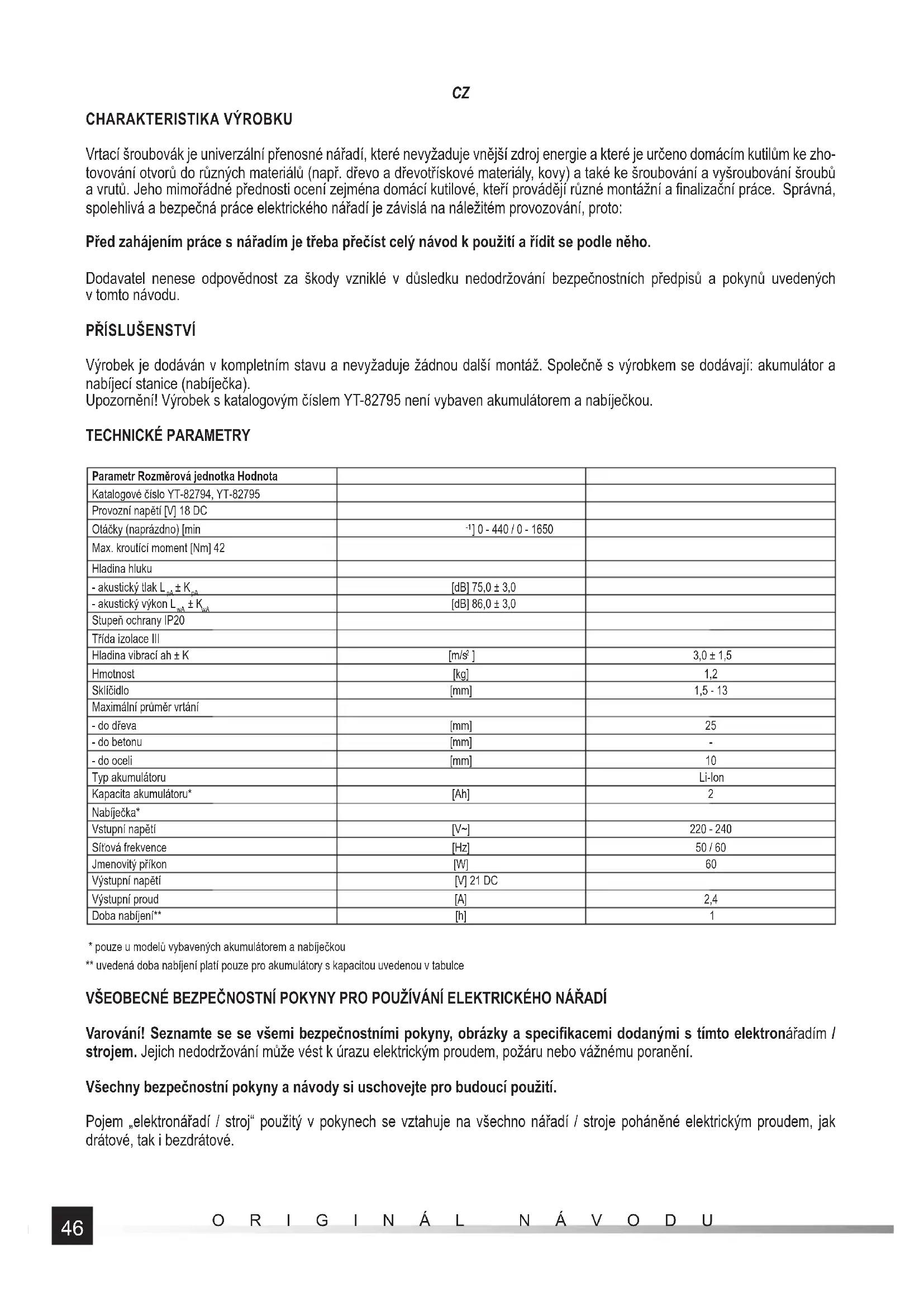 - pouze u modelů vybavených akumulátorem a nabíječkou ** uvedená doba nabíjení platí pouze pro akumulátory s kapacitou uvedenou v tabulce VŠEOBECNÉ BEZPEČNOSTNÍ POKYNY PRO POUŽÍVÁNÍ ELEKTRICKÉHO NÁŘADÍ Varování! Seznamte se se všemi bezpečnostními pokyny, obrázky a specifi kacemi dodanými s tímto elektronářadím / strojem. Jejich nedodržování může vést k úrazu elektrickým proudem, požáru nebo vážnému poranění. Všechny bezpečnostní pokyny a návody si uschovejte pro budoucí použití. Pojem „elektronářadí / stroj“ použitý v pokynech se vztahuje na všechno nářadí / stroje poháněné elektrickým proudem, jak drátové, tak i bezdrátové.47