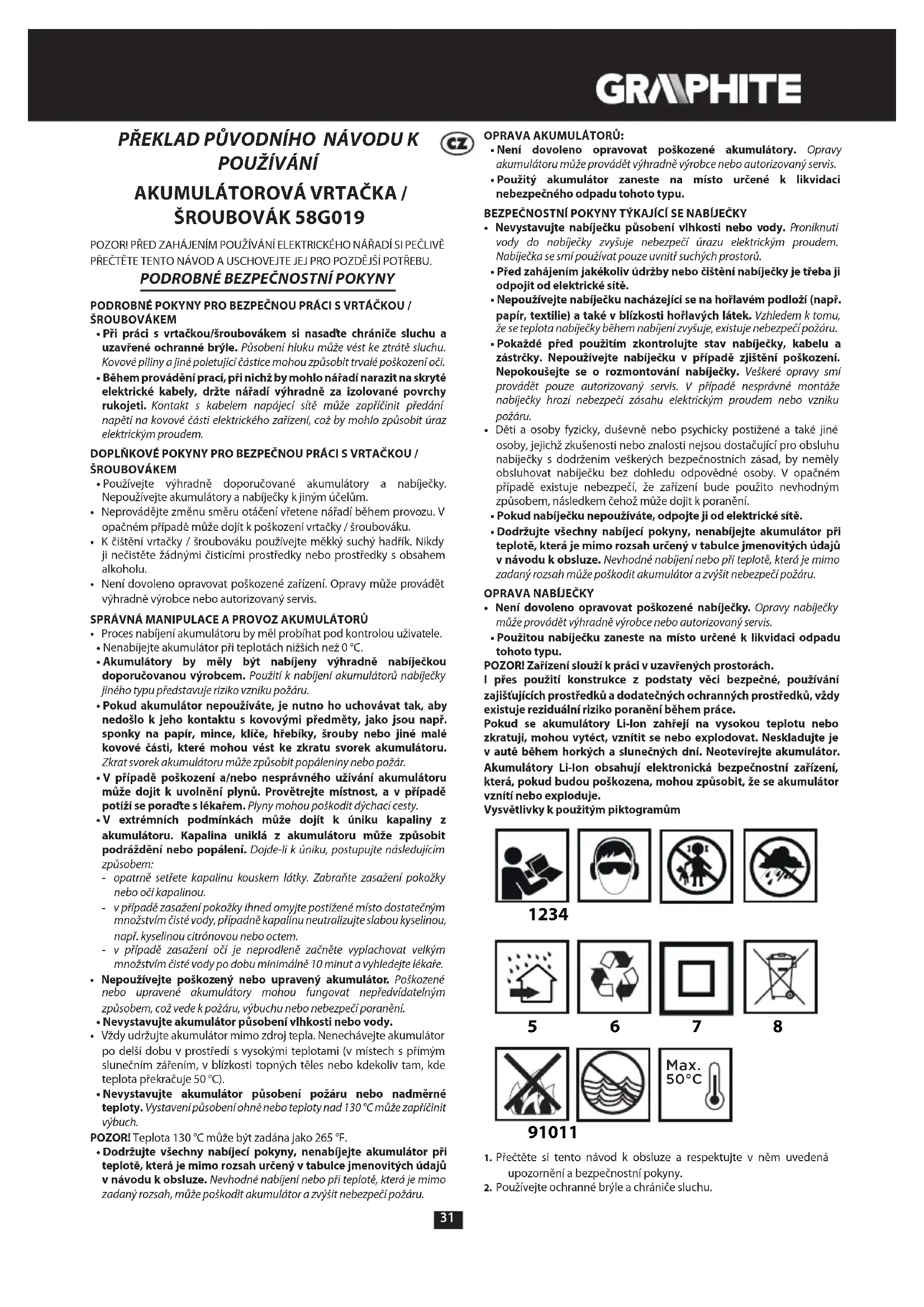 - Není dovoleno opravovat poškozené nabíječky. Opravy nabíječky může provádět výhradně výrobce nebo autorizovaný servis. • Použitou nabíječku zaneste na místo určené k likvidaci odpadu tohoto typu.POZOR! Zařízení slouží k práci v uzavřených prostorách.I přes použití konstrukce z podstaty věci bezpečné, používání zajišťujících prostředků a dodatečných ochranných prostředků, vždy existuje reziduální riziko poranění během práce.Pokud se akumulátory Li-Ion zahřejí na vysokou teplotu nebo zkratují, mohou vytéct, vznítit se nebo explodovat. Neskladujte je v autě během horkých a slunečných dní. Neotevírejte akumulátor. Akumulátory Li-Ion obsahují elektronická bezpečnostní zařízení, která, pokud budou poškozena, mohou způsobit, že se akumulátor vznítí nebo exploduje.Vysvětlivky k použitým piktogramům