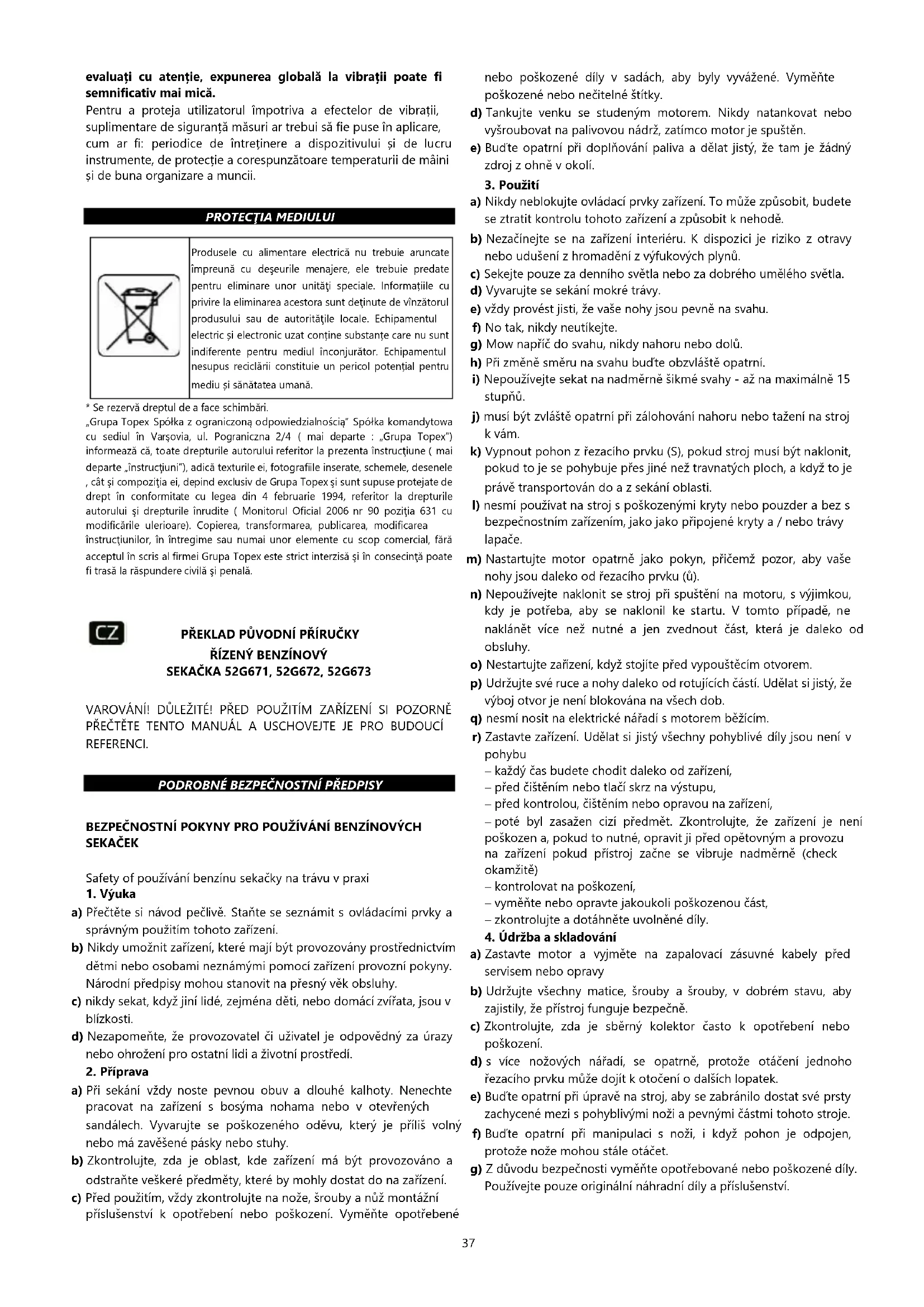 VAROVÁNÍ! Za žádných okolností by se sekačka být použity bez na stráže nainstalovaných. Použití z nesprávných nebo poškozených krytů může způsobit vážné zranění. VAROVÁNÍ! Používání je nesprávné nebo opotřebovanou řezací nůž se zvýší vibrace. Benzínová sekačka na trávu je vybavena systémem zabraňujícím náhodnému spuštění.