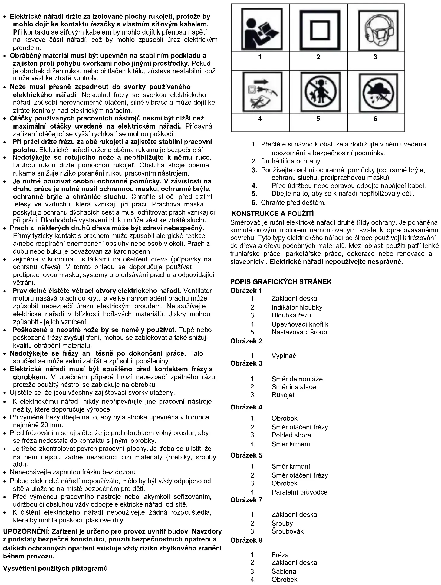- K čištění elektrického nářadí nepoužívejte žádná rozpouštědla, která by mohla poškodit plastové díly. UPOZORNĚNÍ: Zařízení je určeno pro provoz uvnitř budov. Navzdory z podstaty bezpečné konstrukci, použití bezpečnostních opatření a dalších ochranných opatření existuje vždy riziko zbytkového zranění během provozu. Vysvětlení použitých piktogramů