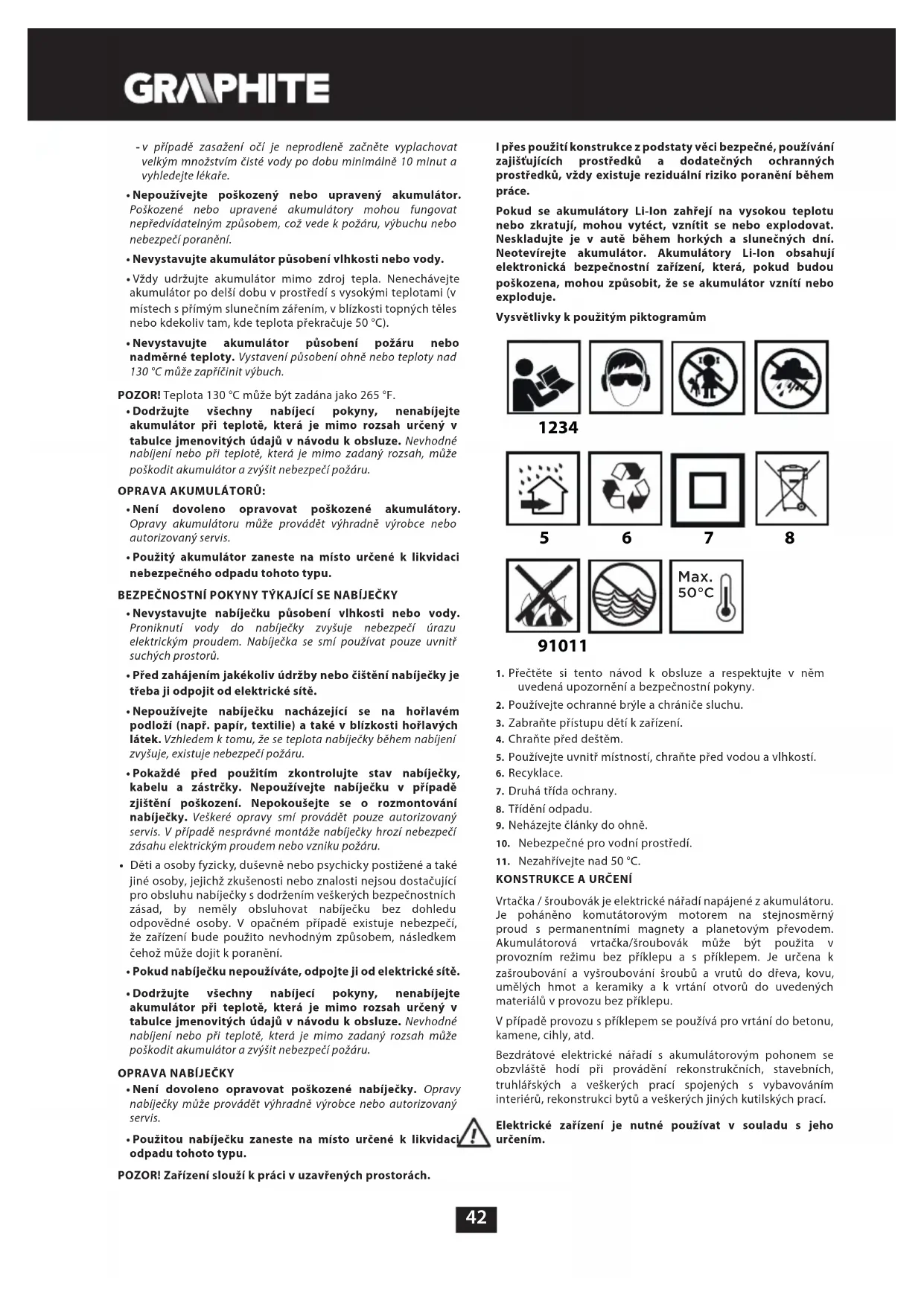 uvedená upozornění a bezpečnostní pokyny. 2. Používejte ochranné brýle a chrániče sluchu.3. Zabraňte přístupu dětí k zařízení. 4. Chraňte před deštěm.5. Používejte uvnitř místností, chraňte před vodou a vlhkostí.6. Recyklace.7. Druhá třída ochrany. 8. Třídění odpadu.9. Neházejte články do ohně.10. Nebezpečné pro vodní prostředí.11. Nezahřívejte nad 50 °C.