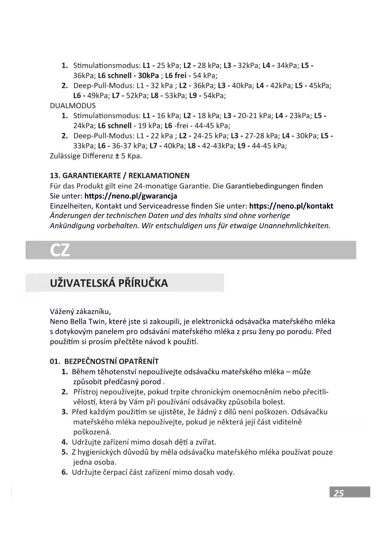 Vážený zákazníku, Neno Bella Twin, které jste si zakoupili, je elektronická odsávačka mateřského mléka s dotykovým panelem pro odsávání mateřského mléka z prsu ženy po porodu. Před použim si prosím přečtěte návod k použi.
