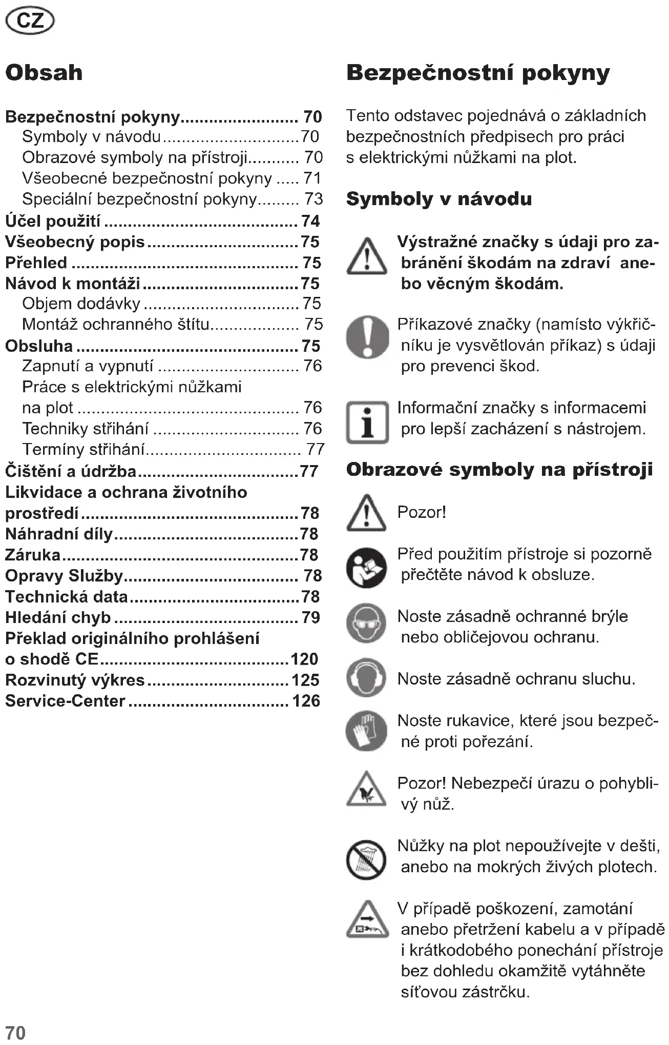 - Bezpečnostní pokyny Tento odstavec pojednává o základních bezpečnostních předpisech pro práci s elektrickými nůžkami na plot. Symboly v návodu Výstražné značky s údaji pro za- bránění škodám na zdraví ane- bo věcným škodám. Příkazové značky (namísto výkřič- níku je vysvětlován příkaz) s údaji pro prevenci škod. Informační značky s informacemi pro lepší zacházení s nástrojem. Obrazové symboly na přístroji Pozor! Před použitím přístroje si pozorně přečtěte návod k obsluze. Noste zásadně ochranné brýle nebo obličejovou ochranu. Noste zásadně ochranu sluchu. Noste rukavice, které jsou bezpeč- né proti pořezání. Pozor! Nebezpečí úrazu o pohybli- vý nůž. Nůžky na plot nepoužívejte v dešti, anebo na mokrých živých plotech. V případě poškození, zamotání anebo přetržení kabelu a v případě i krátkodobého ponechání přístroje bez dohledu okamžitě vytáhněte síťovou zástrčku. Obsah Bezpečnostní pokyny p. 70